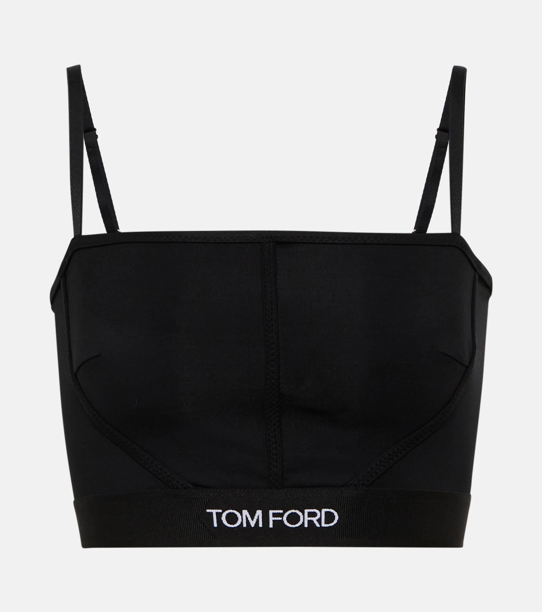 This bralette from Tom Ford is made from a lightweight stretchy fabric and finished with adjustable shoulder straps and a logo jacquard underband. Product Details - Material II: 9% polyamide, 82% polyester, 9% elastane - Made in Italy - Material: 97% modal, 3% elastane - Designer color name: Black - Adjustable shoulder straps - Care instructions: hand wash - Elasticated waistband - Item number: P00638563 Size & Fit - True to size - Fitted - Lightweight material - Stretchy fabric - Cropped - The model seen in the picture is 178cm-5'10" and wearing a size XS