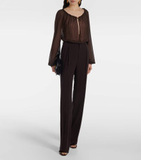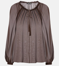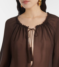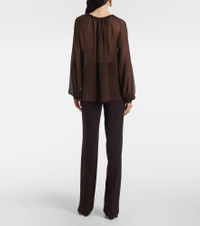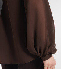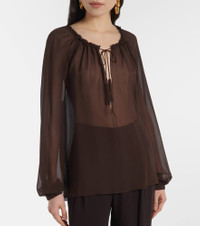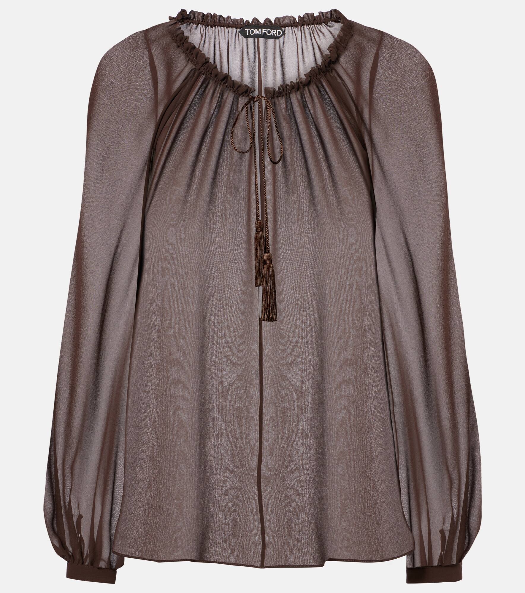 Tom Ford delivers intrigue with this balloon-sleeved sheer silk georgette blouse. The design features a plunging neckline accentuated by a tassel-embellished drawstring closure. Product Details - Material: 100% silk - Care instructions: dry clean - Made in Italy - Designer color name: Dark Brown - Trim: 100% acetate - Item number: P01012828 Size & Fit - Fits small to size - we recommend trying one size larger - Sheer - Designed for a loose fit - Non-stretchy fabric - Falls below the hip - The model seen in the picture is 178cm-5'10" and wearing a size IT 38