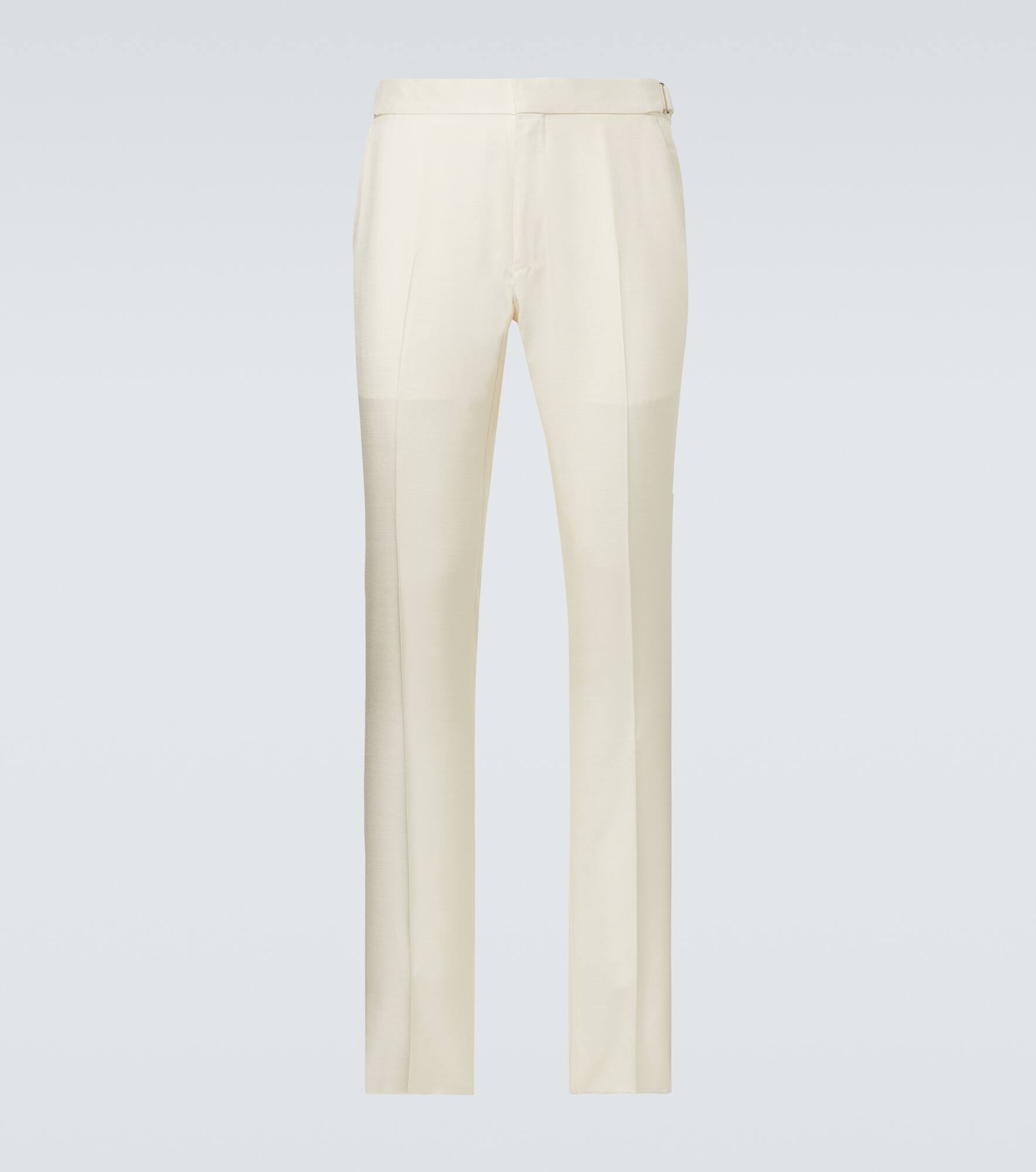 Tom Ford’s tailoring proves that simplicity can be striking. These pants, crafted from lustrous white silk, feature a sleek slim-leg silhouette that balances refined structure with all-day glamour. Product Details - Material: 100% silk - Care instructions: dry clean - Made in Italy - Designer color name: Chalk - Item color: white - Lining: 100% cupro - Pocket lining: 70% cotton, 30% modal - Closure: zipper fly, button and hook fastenings - Pockets: side slit pockets, back pockets - Adjustable tabs at the waist - Hem: unfinished (ready for alteration) - Item number: P01100238 Size & Fit - True to size - Adjustable at the waist - Non-stretchy fabric - Slim-leg - Unhemmed for tailoring - Height of model is 189cm-74.5" and wears a size 50