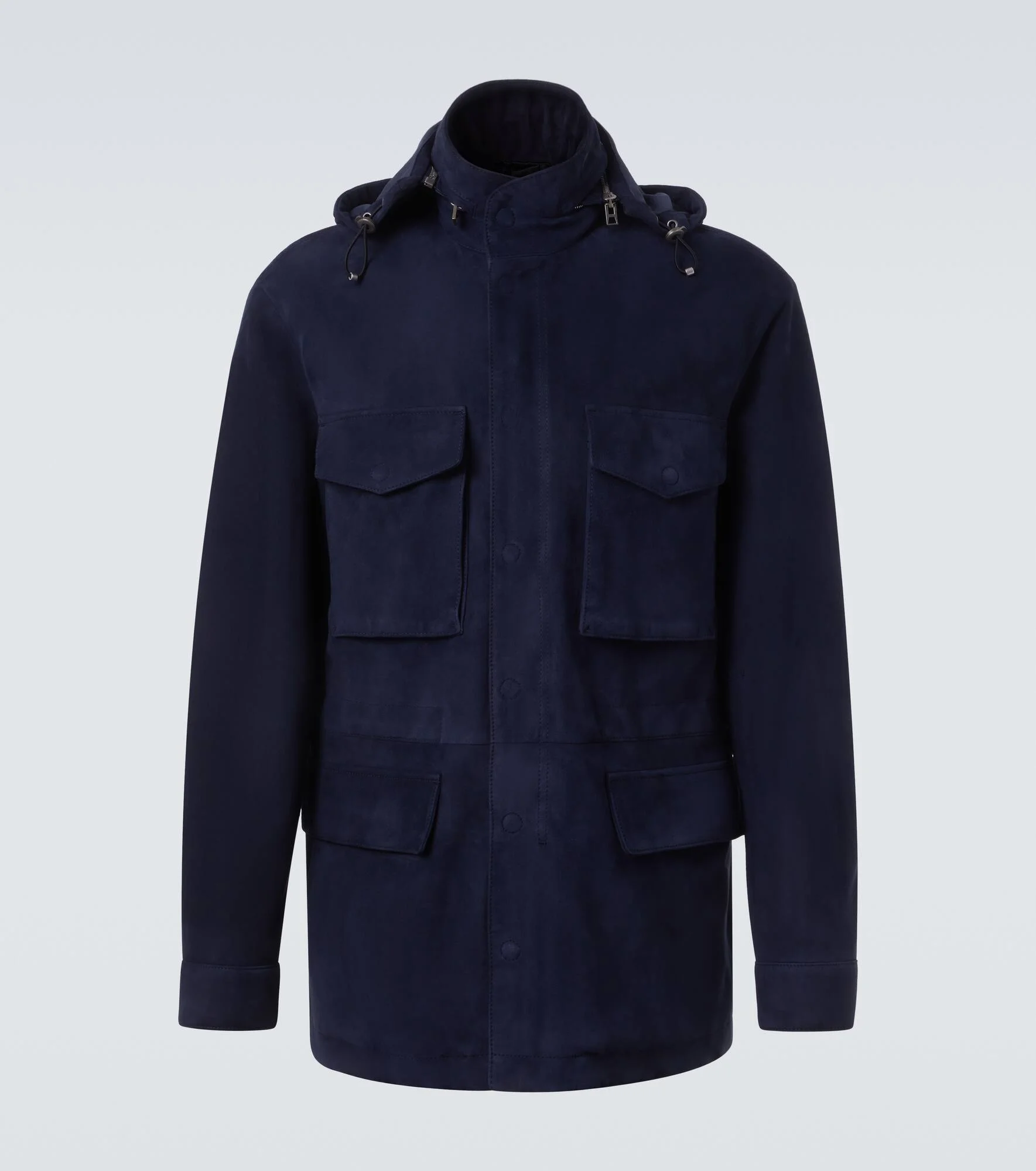 Tom Ford channels bold refinement through immaculate craftsmanship and commanding design. Crafted from soft suede, this field jacket features a long-line silhouette with front flap pockets and a detachable drawstring hood. Product Details - Material: 100% lamb leather (suede) - Care instructions: specialist clean - Made in Italy - Designer color name: Navy - Item color: blue - Lining: 55% cotton, 45% cupro - Sleeve lining: 61% cupro, 39% viscose - Pocket lining: 100% cotton - Contains non-textile parts of animal origin - Includes: garment bag - Detachable drawstring hood - Pockets: flap pockets, snap-buttoned pockets, internal pocket - Elasticated drawstring waist - Cuff: buttoned - Closure: two-way zipped front, snap-buttoned front - Item number: P01095322 Size & Fit - True to size - For a closer fit, we recommend taking one size down - Loose fit, drawstring waist - Non-stretchy fabric - Falls below the hip - The model in the picture is 185cm-6'1" and wearing a size %size%