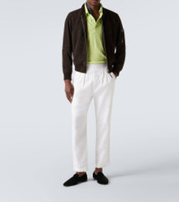 Embrace effortless sophistication with this jacket from Tom Ford. Crafted from supple suede, the piece features two-way zipped front closure, side pockets, and ribbed trims. Product Details - Material: 100% lamb leather (suede) - Care instructions: specialist clean - Made in Italy - Color: brown - Designer color name: Chocolate Torte - Item color: brown - Lining: 56% cotton, 44% viscose - Sleeve lining: 61% cupro, 39% viscose - Pocket lining: 100% cotton - Trim: 90% cotton, 8% polyamide, 2% elastane - Hem: ribbed - Cuff: ribbed - Collar: band - Pockets: side slit pockets, internal pocket - Contains non-textile parts of animal origin - Closure: two-way zipped front - Includes: dust bag - Item number: P01095323 Size & Fit - True to size - Straight fit - Elasticated hem - Non-stretchy fabric - Falls to the hip - The model in the picture is 185cm-6'1" and wearing a size IT 46