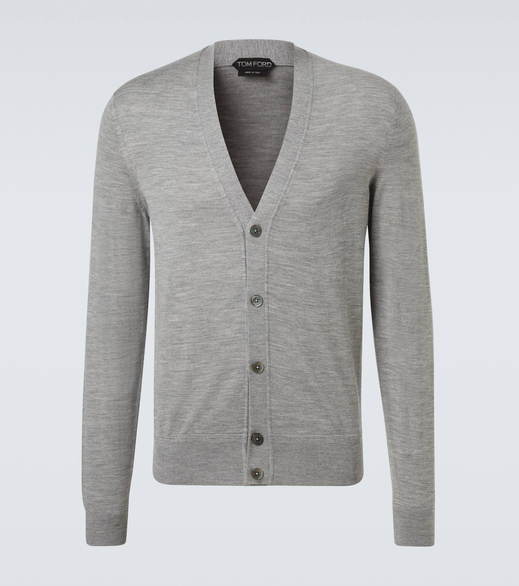 Add this cardigan from Tom Ford to your timeless staples collection. Meticulously knitted from soft wool, the style features a V-neckline and is complete with ribbed trims. Product Details - Material: 100% wool - Care instructions: hand wash - Made in Italy - Designer color name: Light Grey - Item color: gray - Contains non-textile parts of animal origin - Closure: buttoned front - Item number: P01042707 Size & Fit - True to size - For a looser fit, we recommend taking one size up - Slim fit - Stretchy fabric - Falls to the hip - Height of model is 188cm-74" and wears a size IT 52
