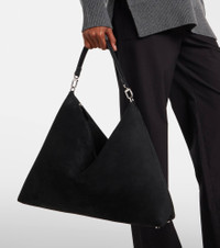 Define your dress code with styles from Toteme, a Stockholm-based brand dedicated to creating a modern uniform. Made in Italy from black suede, the Bevel tote bag is a capacious style with silver-toned hardware. Product Details - Material: leather (suede) - Lining: suede - Made in Italy - Designer color name: Black - Item color: black - Hardware color: silver - Top handle - Closure: zipped top - Internal details: single compartment, internal slot pocket - Includes: dust bag - Item number: P01093281 Size & Fit - Height 35cm-14" - Width 49cm-19.5" - Depth 12cm-4.5" - Length of handles 41cm-16"