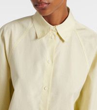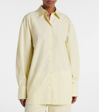 Define your dress code with styles from Toteme, a Stockholm-based brand dedicated to creating a modern uniform. Designed for a boxy fit, this shirt is made from crisp cotton poplin with raglan sleeves and mother-of-pearl buttons. Product Details - Material: 100% cotton (organic) - Care instructions: machine wash at 30 degrees - Made in Turkey - Designer color name: Straw - Item color: yellow - Sleeves: raglan - Item number: P01075220 Size & Fit - Fits large to size - we recommend trying one size smaller - Straight fit - Non-stretchy fabric - Falls below the hip - The model seen in the picture is 178cm-5'10" and wearing a size DE 32