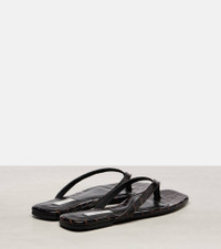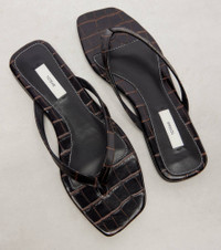 This iteration of Toteme's iconic thong sandals is crafted from croc-effect leather in a charming finish. The minimalist silhouette is defined by square toes, offering an effortlessly chic appeal. Product Details - Upper: calf leather - Lining: sheep leather - Sole: fabric insole, leather sole - Toe shape: square open toe - Made in Italy - Includes: dust bag, shoe box - Designer color name: Dark Brown 034 - Item color: brown - Item number: P01041930 Size & Fit - True to size - Half sizes please take the next size up - European sizes