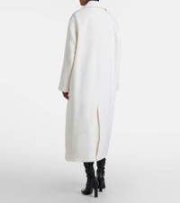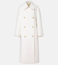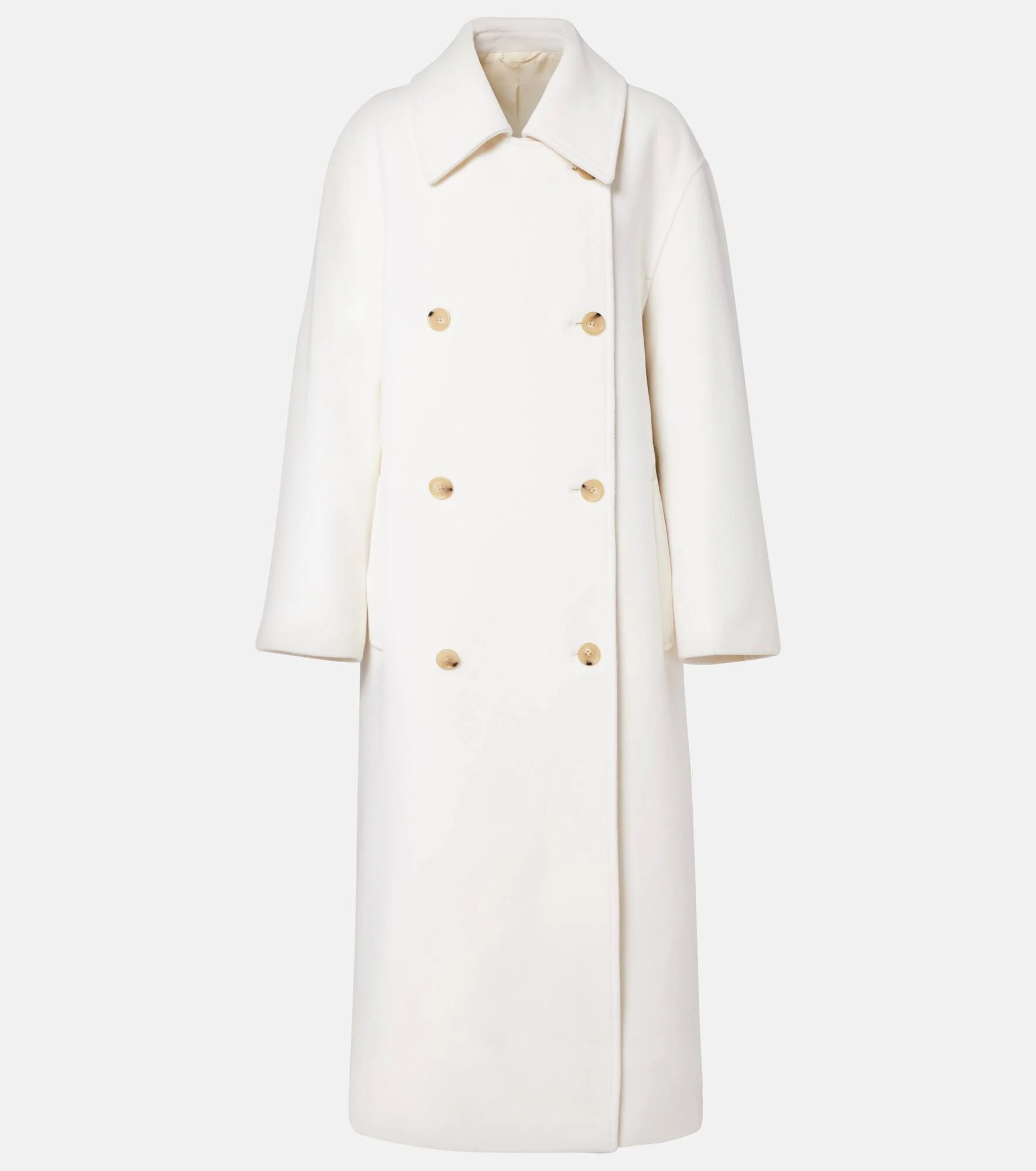 Define your dress code with styles from Toteme, a Stockholm-based brand dedicated to creating a modern uniform. Made from wool-blend material, this coat is a trench-inspired style with a double-breasted silhouette. Product Details - Material: 70% wool, 25% polyamide, 5% cashmere - Care instructions: dry clean - Made in Romania - Designer color name: Ecru - Item color: white - Lining: 100% viscose - Closure: double-breasted - Pockets: welt pockets, internal pocket - Vent: single - Item number: P01136598 Size & Fit - Fits large to size - we recommend trying one size smaller - Dropped shoulders - Oversized - Non-stretchy fabric - The model seen in the picture is 178cm-5'10" and wearing a size DE 32