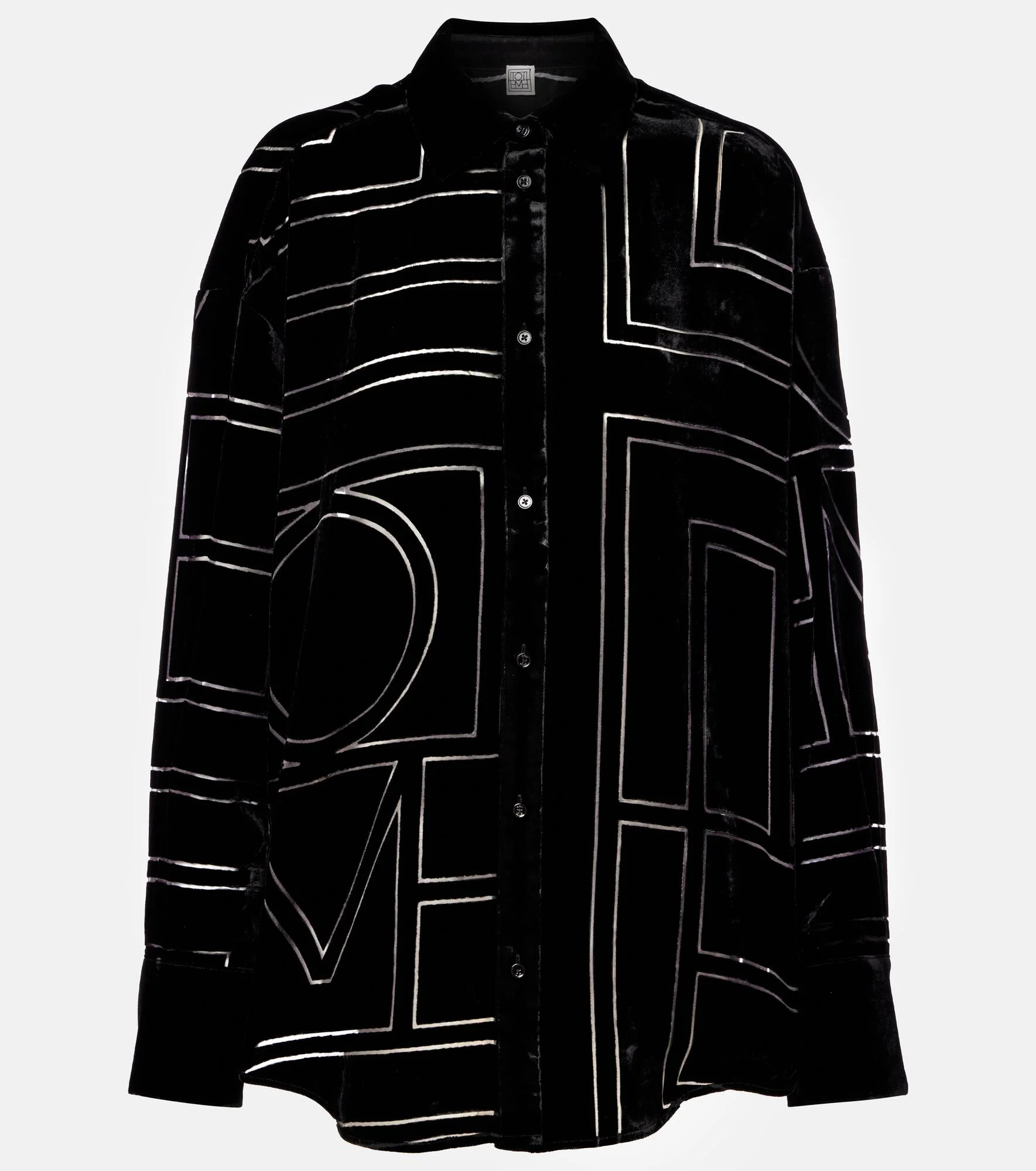 Define your dress code with styles from Toteme, a Stockholm-based brand dedicated to creating a modern uniform. Made from lustrous velvet with an artisanal devore finish, this shirt features the brand's monogram and comes in a relaxed, oversized silhouette. Product Details - Material: 75% viscose, 25% silk - Care instructions: dry clean - Made in China - Color: black - Designer color name: Black - Material II: 100% silk - Collar: classic (Straight point) - Cuff: buttoned - Closure: buttoned front - Item number: P01136634 Size & Fit - True to size - For a closer fit, we recommend taking one size down - Dropped shoulders - Oversized - Non-stretchy fabric - Falls below the hip - The model seen in the picture is 178cm-5'10" and wearing a size DE 34