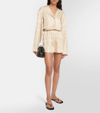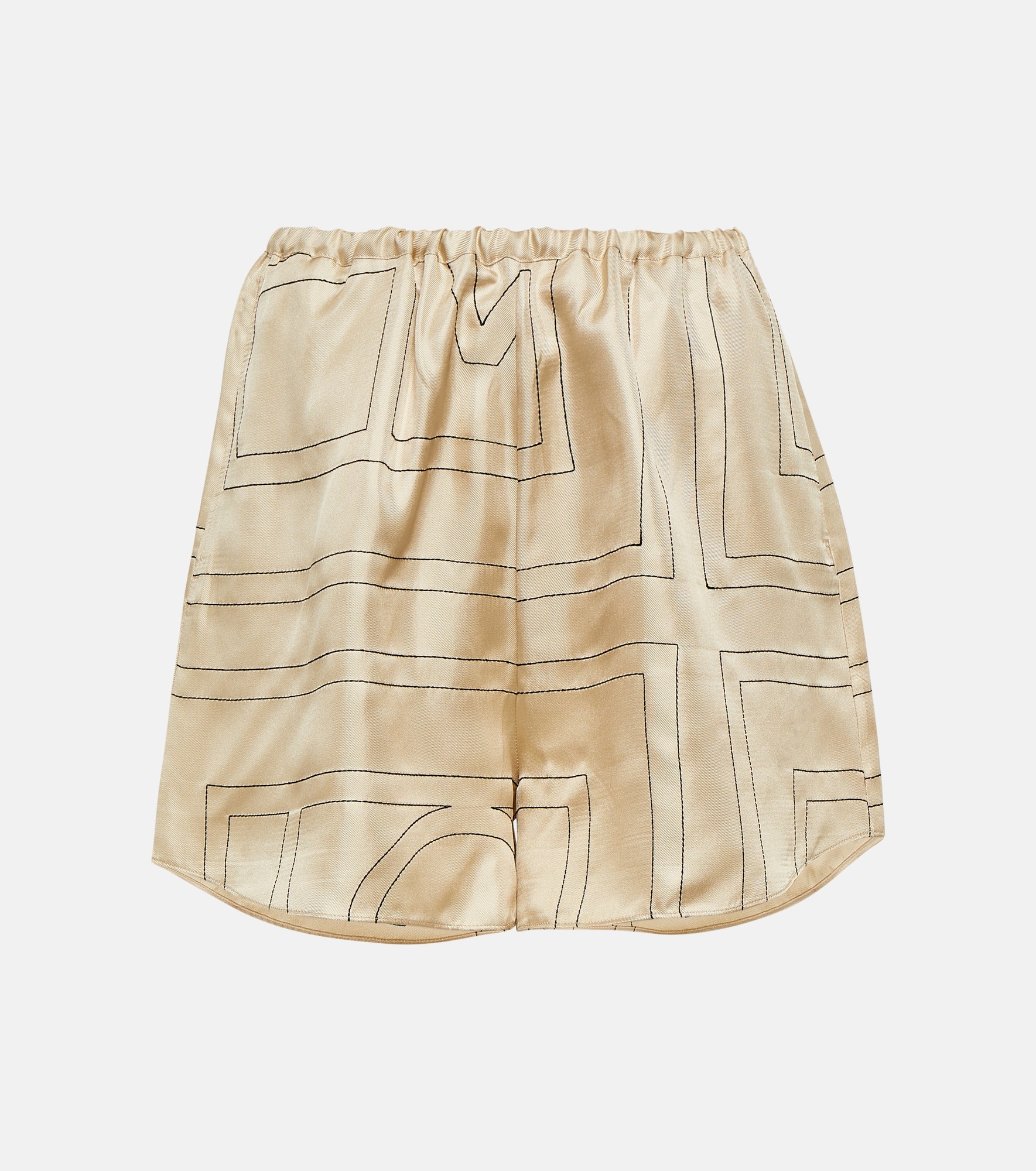 Made from luxuriously soft silk twill, these shorts from Toteme are entirely covered with a large logo pattern stitched with contrast white thread. This style is finished with an elasticated waistband for comfort. Product Details - Made in China - Pockets: side slit pockets - Material: 100% silk - Designer color name: Ivory Monogram - Care instructions: dry clean - Item number: P00825769 Size & Fit - True to size - Elasticated waist - Lightweight material - Wide-leg - Inseam length approx: 31cm-12" - The model seen in the picture is 178cm-5'10" and wearing a size DT 34