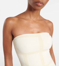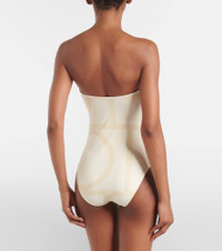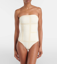 Define your dress code with styles from Toteme, a Stockholm-based brand dedicated to creating a modern uniform. Cut from stretch jersey, this swimsuit showcases a flattering strapless silhouette and the brand signature monogram. Product Details - Material: 43% polyamide (recycled), 29% polyamide, 28% elastane - Care instructions: machine wash at 30 degrees - Made in Portugal - Designer color name: Ecru/Straw - Lining: 50% polyamide (recycled), 34% polyamide, 16% elastane - Item number: P01040573 Size & Fit - True to size - Strapless - Unpadded Top - High-cut leg - The model seen in the picture is 178cm-5'10" and wearing a size XS