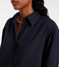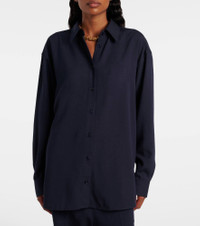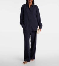 Define your dress code with styles from Toteme, a Stockholm-based brand dedicated to creating a modern uniform. Featuring an oversized silhouette, this shirt is complete with a pointed collar and buttoned cuffs. Product Details - Material: 90% viscose, 10% wool - Care instructions: dry clean - Made in Turkey - Designer color name: Navy - Item color: blue - Collar: classic (Straight point) - Closure: buttoned placket - Cuff: buttoned - Item number: P01101990 Size & Fit - True to size - Dropped shoulders - Designed for a loose fit - Non-stretchy fabric - Falls below the hip - The model seen in the picture is 178cm-5'10" and wearing a size DE 34