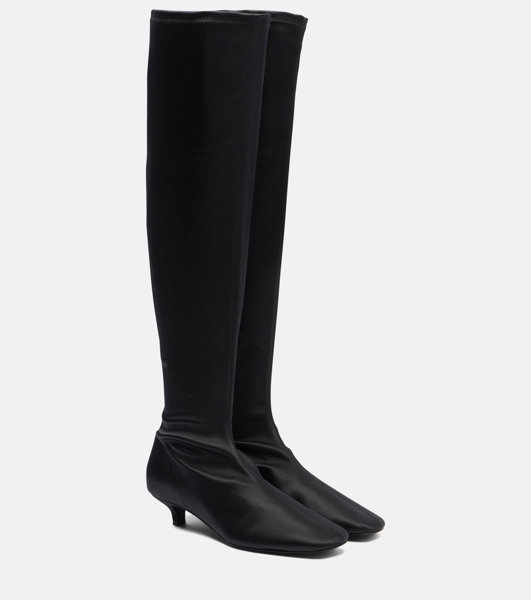 Define your dress code with styles from Toteme, a Stockholm-based brand dedicated to creating a modern uniform. Expertly crafted from lustrous satin, these knee-high boots are complete with 35mm kitten heels. Product Details - Upper: fabric - Lining: fabric - Sole: leather insole and sole - Toe shape: square toe - Made in Italy - Includes: shoe box, dust bag - Designer color name: Black - Item color: black - Item number: P01100347 Size & Fit - True to size - European sizes - 3,5cm-1.5" heel (size EU 38) - 54cm-21.5" shaft height (size EU 38) - 35cm-14" shaft width (size EU 38) - shaft width measured on largest part of boot