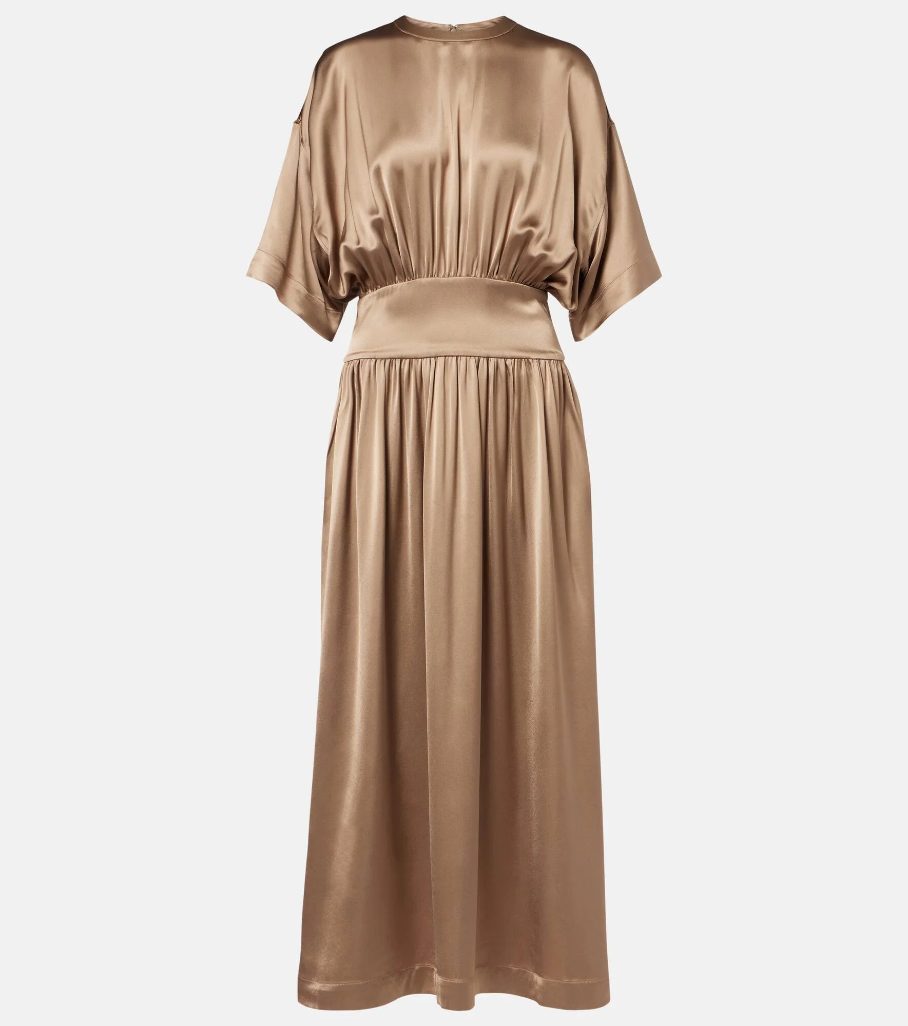 Define your dress code with styles from Toteme, a Stockholm-based brand dedicated to creating a modern uniform. This midi dress is made from satin in a flowing silhouette and features a cinched waist. Product Details - Material: 100% viscose - Care instructions: dry clean - Made in China - Color: beige - Designer color name: Latte - Closure: concealed zipped back - Item number: P01136661 Size & Fit - True to size - Dropped shoulders - Cinched waist - Non-stretchy fabric - The model seen in the picture is 178cm-5'10" and wearing a size DE 34