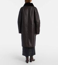 Define your dress code with styles from Toteme, a Stockholm-based brand dedicated to creating a modern uniform. Made from dark brown leather with tonal shearling lining, this coat is a single-breasted piece with concealed button fastenings and an oversized silhouette. Product Details - Material: 100% lamb leather - Care instructions: specialist clean - Made in Turkey - Designer color name: Dark Brown - Item color: brown - Lining: 100% shearling - Closure: buttoned front - Pockets: side slit pockets - Item number: P01136682 Size & Fit - True to size - For a closer fit, we recommend taking one size down - Dropped shoulders - Oversized - Non-stretchy fabric - Falls below the hip - The model seen in the picture is 178cm-5'10" and wearing a size DE 32