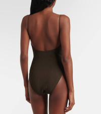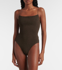 Define your dress code with styles from Toteme, a Stockholm-based brand dedicated to creating a modern uniform. Crafted from jersey, this swimsuit showcases shirred detailing and a flattering scooped back. Product Details - Material: 80% polyamide, 20% elastane - Care instructions: hand wash - Made in China - Designer color name: Pepper - Item number: P01040576 Size & Fit - True to size - Petite sizing - Unpadded Top - Medium-cut leg - The model seen in the picture is 178cm-5'10", cup size B, and wearing a size XS