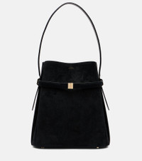Crafted from soft suede, this bucket bag from Toteme features a structured silhouette with a belt detail and gold-tone clasp at the front. It is finished with a shoulder strap and a spacious interior for sorting your essentials. Product Details - Material: leather (suede) - Lining: leather - Made in Italy - Designer color name: Black - Item color: black - Contains non-textile parts of animal origin - Internal details: internal slot pockets - Item number: P01024005 Size & Fit - Height 30cm-12" - Width 28cm-11" - Depth 15,5cm-6" - Length of handle 64cm-25"
