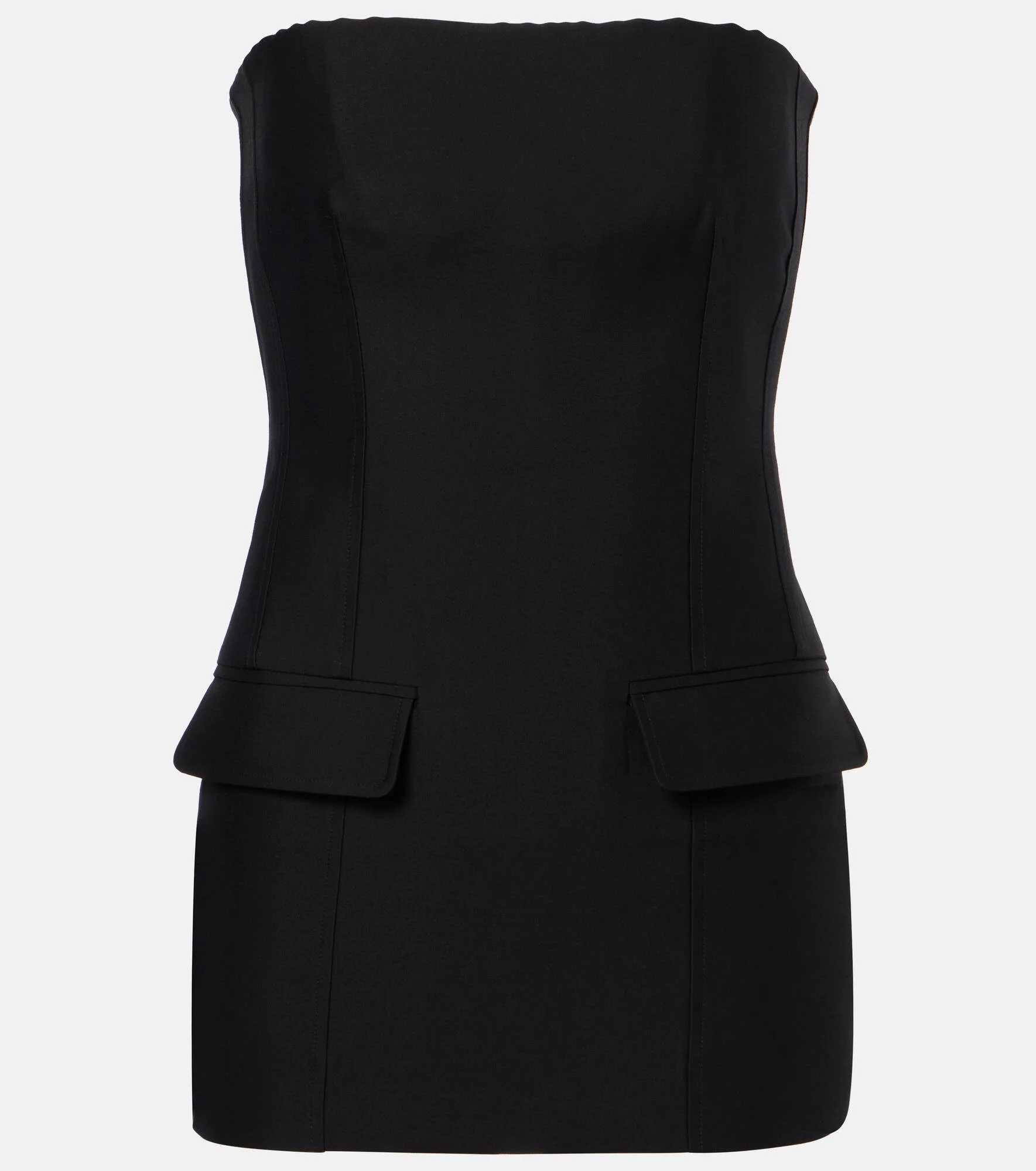 Define your dress code with styles from Toteme, a Stockholm-based brand dedicated to creating a modern uniform. This strapless top is made from wool and silk crepe for a look inspired by tailoring traditions. Product Details - Material: 81% wool, 19% silk - Care instructions: dry clean - Made in China - Color: black - Designer color name: Black - Lining: 100% viscose - Trim: 80% acetate, 20% polyester - Details: 85% polyamide, 15% elastane - Closure: concealed zipped back - Item number: P01136627 Size & Fit - True to size - Strapless - Internal boned corset for support - Fitted - Non-stretchy fabric - Falls below the hip - The model seen in the picture is 178cm-5'10" and wearing a size DE 34