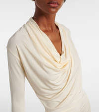 Tap into Tove's refined minimalism with the Vevina maxi dress. This long-sleeve style is made from a soft jersey fabric and features a cowl neckline for a sophisticated touch. Product Details - Material: 95% viscose, 5% elastane - Care instructions: machine wash at 30 degrees - Made in Portugal - Designer color name: Cream - Item color: white - Collar: cowl neck - Item number: P01096258 Size & Fit - Fits large to size - we recommend trying one size smaller - Dropped shoulders - Cinched waist - Stretchy fabric - The model seen in the picture is 178cm-5'10" and wearing a size FR 34