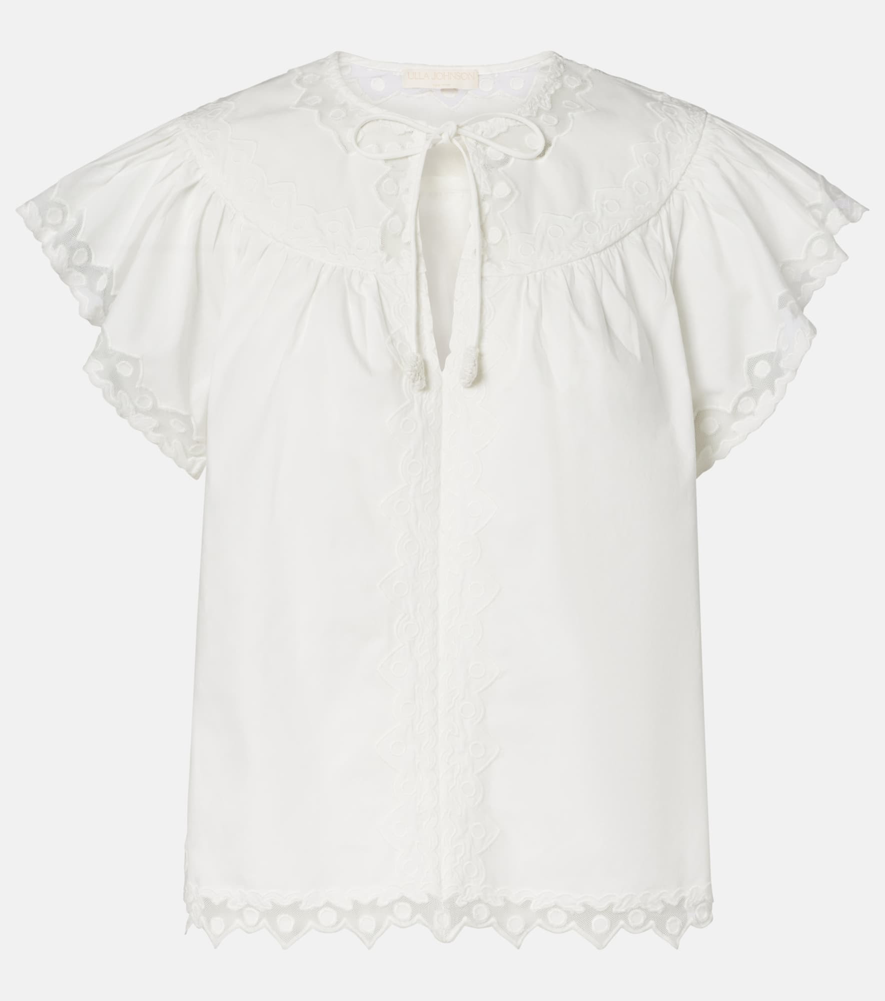 Crafted from soft cotton, the Effie top from Ulla Johnson features a breezy silhouette with tonal geometric embroidery and delicate tulle appliques. The loose fit silhouette is complete with fluttering short sleeves and a self-tie neckline. Product Details - Material: 100% cotton - Care instructions: dry clean - Made in India - Designer color name: Pristine - Item color: white - Trim: 100% nylon - Embroidery: 100% polyester - Closure: self-ties - Item number: P01078707 Size & Fit - True to size - Designed for a loose fit - Non-stretchy fabric - Falls to the hip - The model seen in the picture is 178cm-5'10" and wearing a size US 4