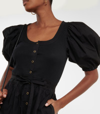 Ulla Johnson's Leia playsuit is made from cotton poplin and ribbed jersey. It has puff sleeves, a scoop neckline, a snap-button placket, and a self-tie sash. Product Details - Care instructions: machine wash - Belt loops, Detachable belt - Pockets: side slit pockets - Designer color name: Noir - Closure: snap-buttoned front - Material: 100% cotton - Pocket lining: 100% cotton - Made in Turkey - Item number: P00712072 Size & Fit - True to size - Loose fit, drawstring waist - Wide-leg - High-waisted - The model seen in the picture is 178cm-5'10" and wearing a size US 4