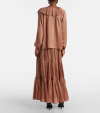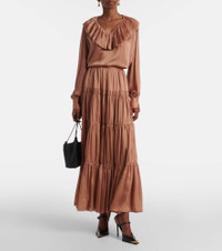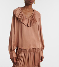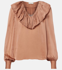 Ulla Johnson designs wanderlust-inspiring pieces full of worldly flair. The Liese blouse is crafted from silk satin and is complete with a ruffled, pleated collar. Product Details - Material: 100% silk - Care instructions: dry clean - Made in China - Designer color name: Desert Rose - Item color: pink - Cuff: one button - Item number: P01100383 Size & Fit - True to size - Designed for a loose fit - Non-stretchy fabric - Falls below the hip - The model seen in the picture is 178cm-5'10" and wearing a size US 4