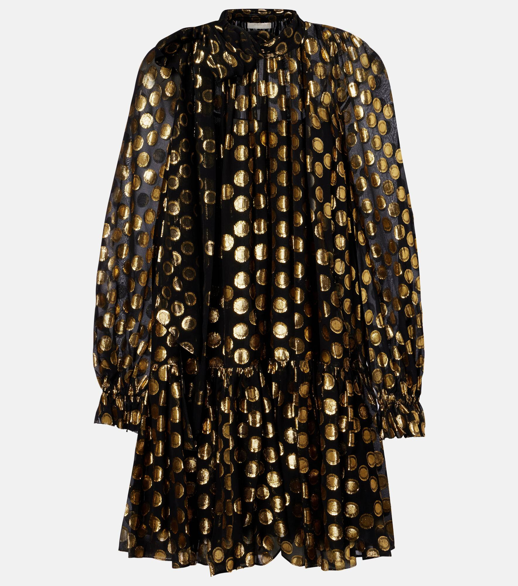 The Loretta minidress from Ulla Johnson is the perfect match for special occasions, everyday looks, and everything in between. Made from silk-blend fil coupe, the style is enriched with an eye-catching polka-dot pattern and a self-tie at the neckline. Product Details - Material: 83% silk, 17% polyester - Care instructions: dry clean - Made in China - Designer color name: Obsidian - Item color: black, gold - Lining: 100% polyester - Self-tie neck - Cuff: elasticated - Detachable lining - Item number: P01100393 Size & Fit - True to size - Designed for a loose fit - Non-stretchy fabric - The model seen in the picture is 178cm-5'10" and wearing a size US 4