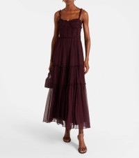 Trust Ulla Johnson to deliver charming and easy-to-style staples like the Talitha dress. Crafted from crinkled silk chiffon, this delicate design features a ruffle-embellished bodice and a soft midi skirt. Product Details - Material: 100% silk - Care instructions: dry clean - Made in China - Designer color name: Mahogany - Item color: burgundy - Lining: 100% polyester - Closure: zipped side - Fully lined - Item number: P01100386 Size & Fit - True to size - Low back - Cinched waist - Non-stretchy fabric - The model seen in the picture is 178cm-5'10" and wearing a size US 4