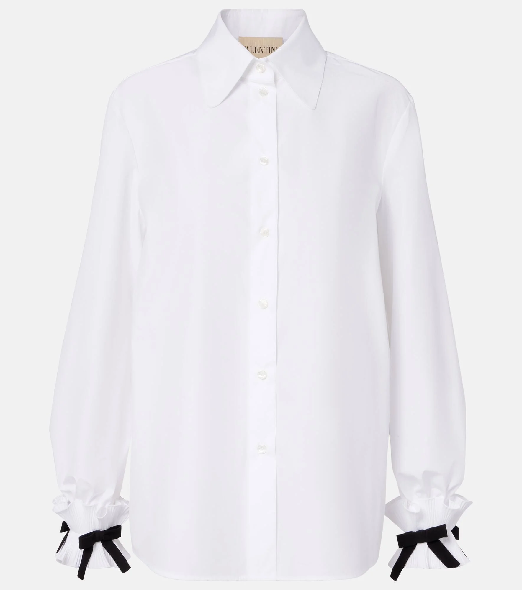 Valentino has become a symbol of crafting excellence, creativity, and uniqueness. This shirt is made from cotton-blend poplin and adorned with contrasting bows on the ruffled cuffs. Product Details - Material: 75% cotton, 25% polyester - Care instructions: dry clean - Made in Italy - Color: white - Designer color name: Bianco/Nero - Trim: 100% silk - Contains non-textile parts of animal origin - Collar: club - Snap-buttoned cuffs - Closure: buttoned front - Item number: P01108332 Size & Fit - True to size - Straight fit - Non-stretchy fabric - Falls below the hip - The model seen in the picture is 178cm-5'10" and wearing a size IT 40