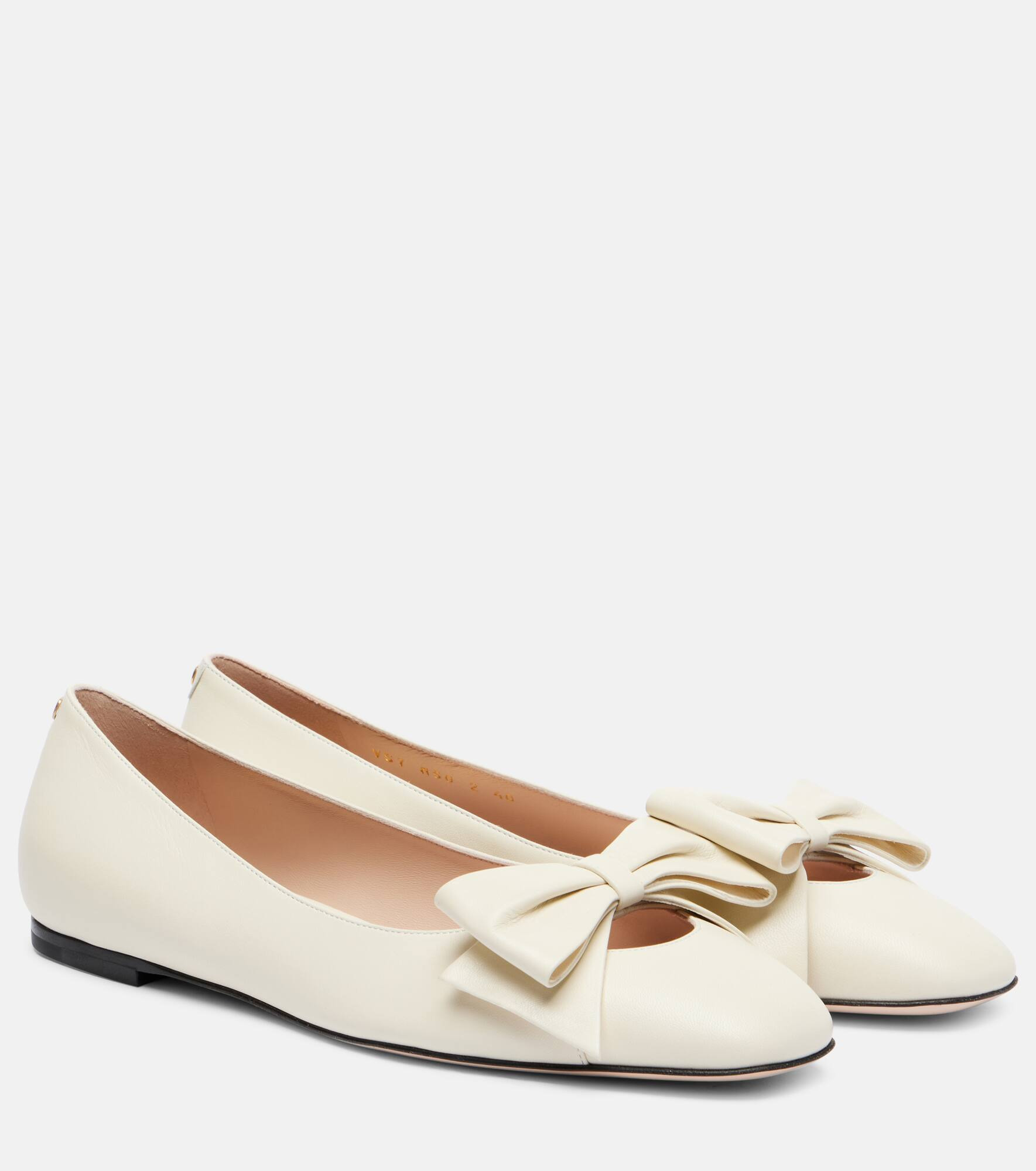 Crafted in Italy from supple leather, these ballet flats from Valentino Garavani feature an elegant silhouette with bow detailing. The slip-on design is complete with rounded toes and leather soles for a sophisticated finish. Product Details - Upper: leather - Lining: leather - Sole: leather insole and sole - Toe shape: round toe - Made in Italy - Includes: dust bag, shoe box - Designer color name: Ivory - Item color: white - Item number: P01061804 Size & Fit - True to size - European sizes