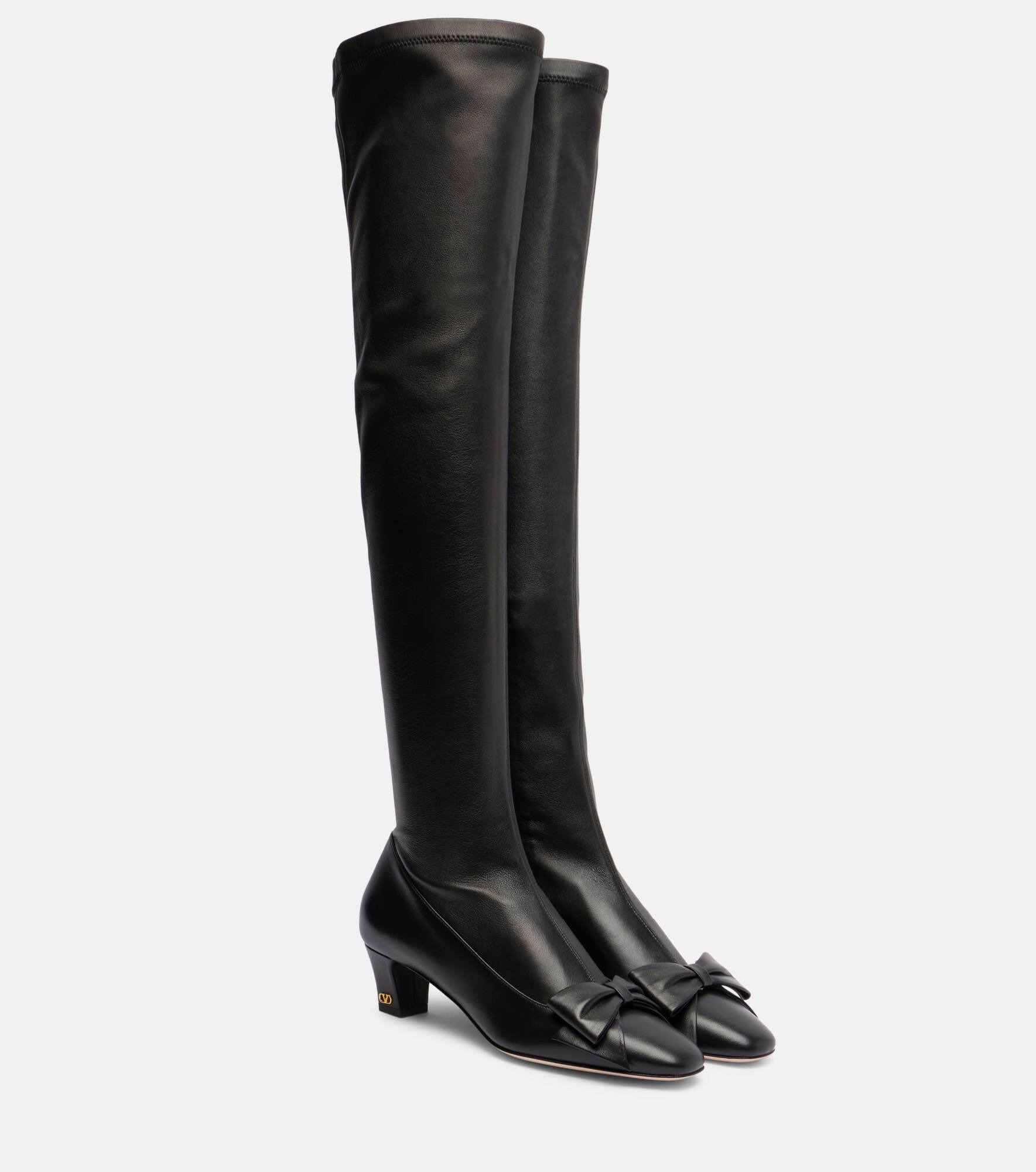 At once iconic and understated, Valentino Garavani's VLogo carries the Maison's legacy of elegance. It's featured on the 45mm heels of the Bowow boots, crafted from leather and finished with tonal bows on the vamps. Product Details - Upper: leather - Lining: fabric, leather - Sole: leather insole and sole - Toe shape: round toe - Made in Italy - Includes: shoe box - Designer color name: Nero - Item color: black - Closure: zipped side - Item number: P01062043 Size & Fit - True to size - European sizes - 4,5cm-2" heel (size EU 38) - 59cm-23" shaft height (size EU 38) - 38cm-15" shaft width (size EU 38) - shaft width measured on largest part of boot