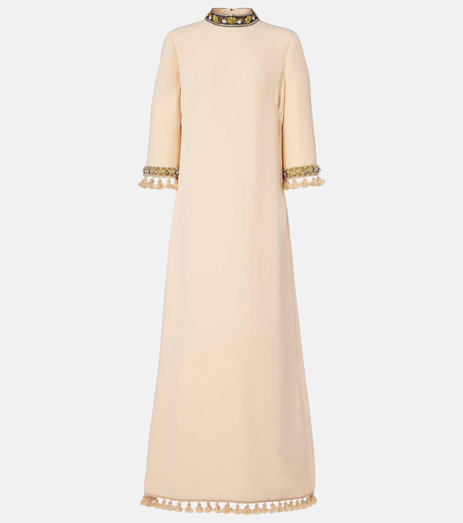 Made from swathes of pure silk, Valentino's signature Cady Couture lends fluidity to each style. This beautiful gown features a clean, A-line silhouette and is finished with floral embellished trims and soft tassels swinging from the hemline and sleeves. Product Details - Material: 100% silk - Care instructions: dry clean - Made in Italy - Designer color name: Betulla/Multicolor - Item color: beige - Material II: 100% silk - Material III: 100% silk - Lining: 100% silk - Embroidery: 39% metallic fibres, 35% polyamide, 26% other fibres - Details: 100% polyester - Trim: 75% viscose, 25% wool - Insert: 100% cotton - Material IV: 98% cotton, 1% elastane, 1% polyamide - Includes: dust bag - Item number: P01060208 Size & Fit - True to size - Designed for a loose fit - Non-stretchy fabric - The model seen in the picture is 178cm-5'10" and wearing a size IT 40