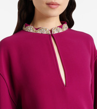 Product Details - Material: 100% silk - Care instructions: dry clean - Made in Italy - Designer color name: Phalaris Magenta/Gold/Silver - Comes with garment bag - Detachable band - Closure: hook fastening - Embroidery: 100% polyester - Item number: P01006417 Size & Fit - True to size - Dropped shoulders - Loose fit, comes with belt - Non-stretchy fabric - The model seen in the picture is 178cm-5'10" and wearing a size IT 40
