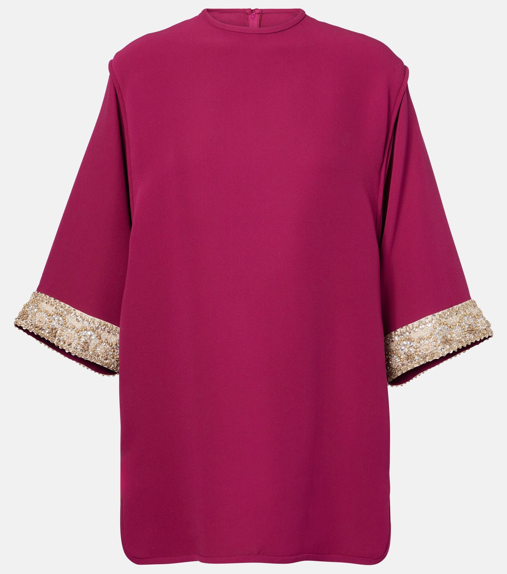 Product Details - Material: 100% silk - Care instructions: dry clean - Handmade in the United Arab Emirates - Designer color name: Phalaris Magenta/ Gold/ Silver - Material II: 100% silk - Material III: 100% silk - Embroidery: 100% polyester - Material IV: 68% polyester, 32% metallic fibres - Closure: zipped back - Item number: P01006421 Size & Fit - True to size - Dropped shoulders - Designed for a loose fit - Non-stretchy fabric - Falls below the hip - The model seen in the picture is 178cm-5'10" and wearing a size IT 40
