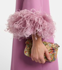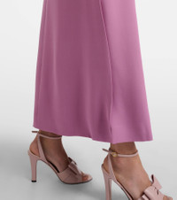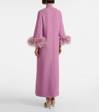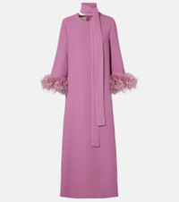 The most established Italian Maison de Couture, Valentino has become a symbol of crafting excellence. Crafted from the brand's signature Cady Couture fabric, consisting of only pure silk, this maxi dress features a scarf detail and feather trims at the ends of the mid-length sleeves. Product Details - Material: 100% silk - Care instructions: dry clean - Made in Italy - Designer color name: Purple Flare - Item color: purple - Lining: 91% viscose, 9% elastane - Trim: 100% feathers - Material II: 100% silk - Contains non-textile parts of animal origin - Detachable band - Closure: concealed zipped back - Long vent - Includes: garment bag - Item number: P01108246 Size & Fit - True to size - Designed for a loose fit - Non-stretchy fabric - The model seen in the picture is 178cm-5'10" and wearing a size IT 40