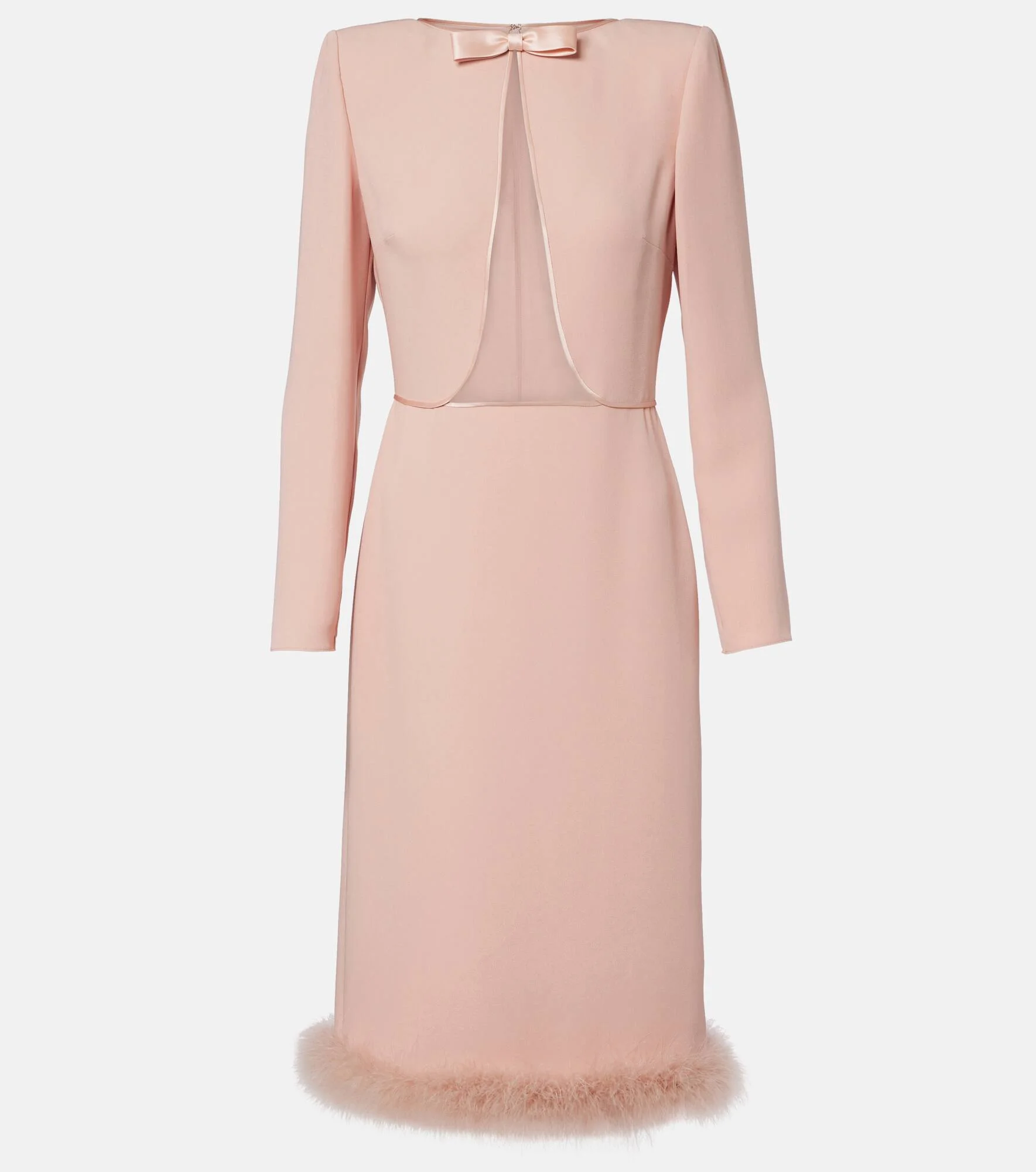 Made from swathes of pure silk, Valentino's signature Cady Couture lends fluidity to each style. This midi dress is adorned with a lustrous bow at the crewneck, while fluffy feathers trim the skirt. Product Details - Material: 100% silk - Care instructions: dry clean - Made in Italy - Color: pink - Designer color name: Rose - Material II: 100% silk - Details: 100% silk - Lining: 91% viscose, 9% elastane - Trim: 100% turkey feathers - Insert: 100% silk - Contains non-textile parts of animal origin - Includes: dust bag - Item number: P01108255 Size & Fit - True to size - Shoulder pad inserts - Fitted - Slightly stretchy fabric - slit length 25cm-10" - The model seen in the picture is 178cm-5'10" and wearing a size IT 40