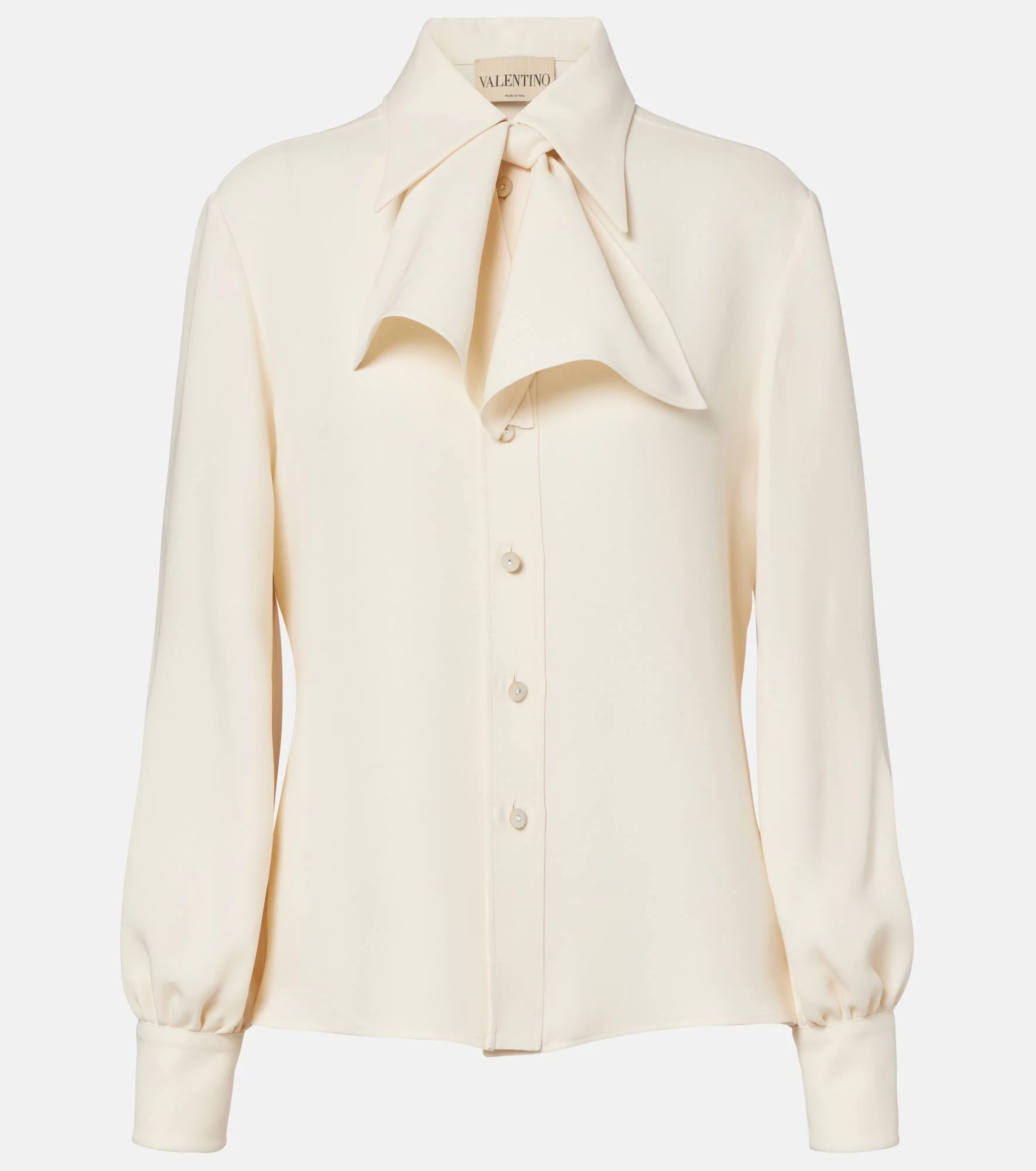 Made from swathes of pure silk, Valentino's signature Cady Couture lends fluidity to each style. Made in Italy, this candid blouse is complete with a bow detail at the neckline. Product Details - Material: 100% silk - Care instructions: dry clean - Made in Italy - Designer color name: Vaniglia - Item color: white - Contains non-textile parts of animal origin - Detachable band - Collar: classic (Straight point) - Cuff: two buttons - Closure: buttoned front - Item number: P01107818 Size & Fit - True to size - Cinched waist - Non-stretchy fabric - Falls below the hip - The model seen in the picture is 178cm-5'10" and wearing a size IT 40