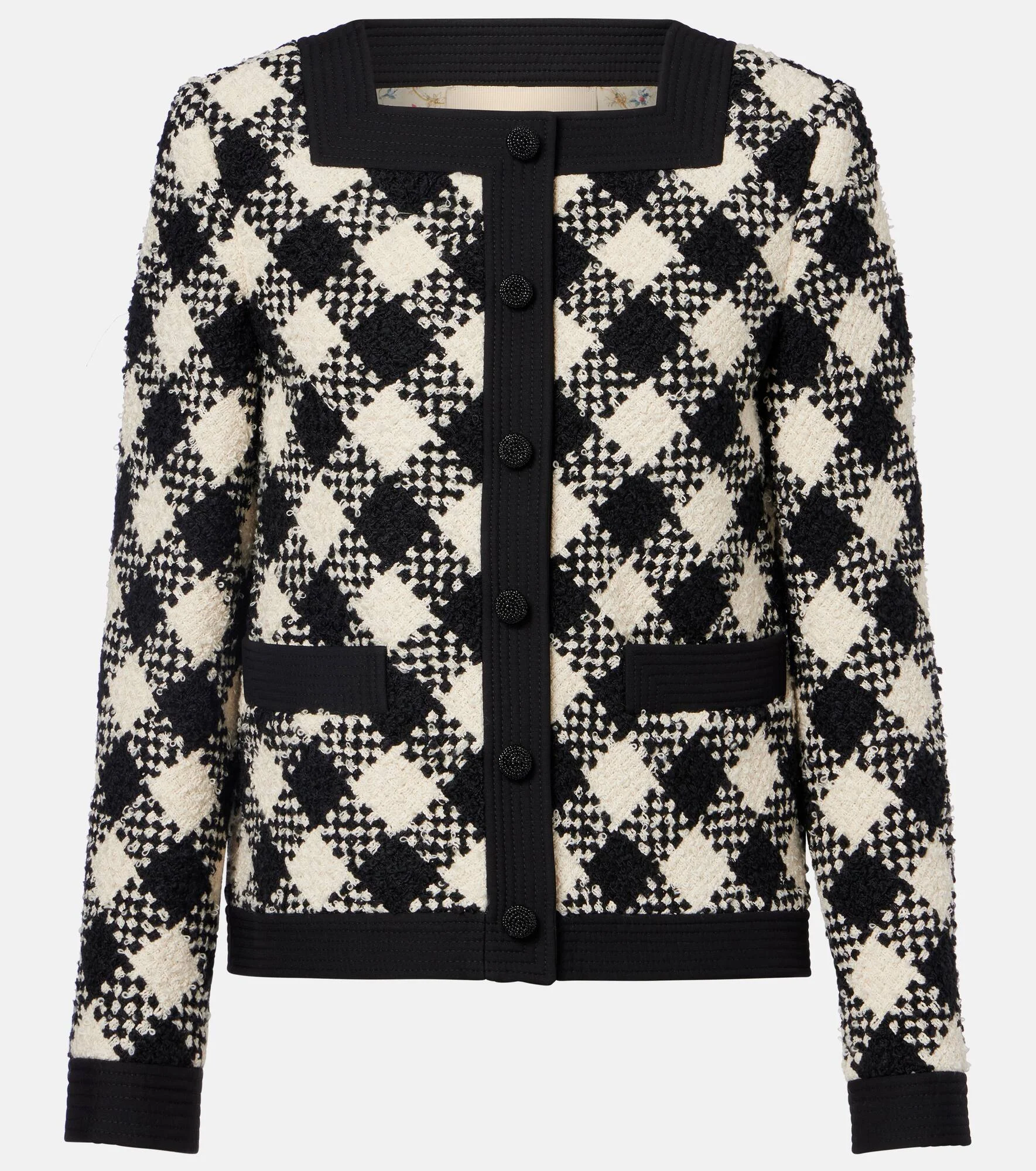 Embrace timeless elegance with this jacket from Valentino. Crafted from checked tweed, the design features a ruffled collar and cuffs, complemented by embellished buttons at the front. Product Details - Material: 44% cotton, 18% wool, 16% viscose, 12% acrylic, 8% polyamide, 2% mohair - Care instructions: dry clean - Made in Italy - Designer color name: Burro/Nero - Item color: black, white - Trim: 65% wool, 35% silk - Lining: 100% silk - Filling: 100% polyester - Closure: buttoned front - Pockets: welt pockets - Item number: P01107840