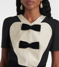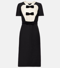 Contemporary with a vintage flavor, this midi dress is part of Valentino's Pavillon des Folies collection. The chic design is cut from Crepe Couture to a minimalist silhouette and elevated by unique details such as the plastron and decadent velvet bows. Product Details - Material: 65% wool, 35% silk - Care instructions: dry clean - Made in Italy - Designer color name: Nero/Soft Beige - Item color: black, white - Material II: 58% cotton, 42% acetate - Lining: 74% acetate, 26% silk - Lining II: 100% viscose - Trim: 98% cotton, 2% elastane - Closure: zipped back - Detachable belt - Item number: P01026780 Size & Fit - True to size - Cinched waist - Non-stretchy fabric - The model seen in the picture is 178cm-5'10" and wearing a size IT 40