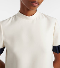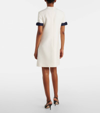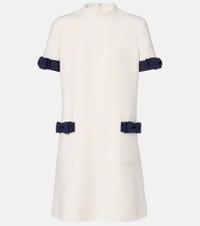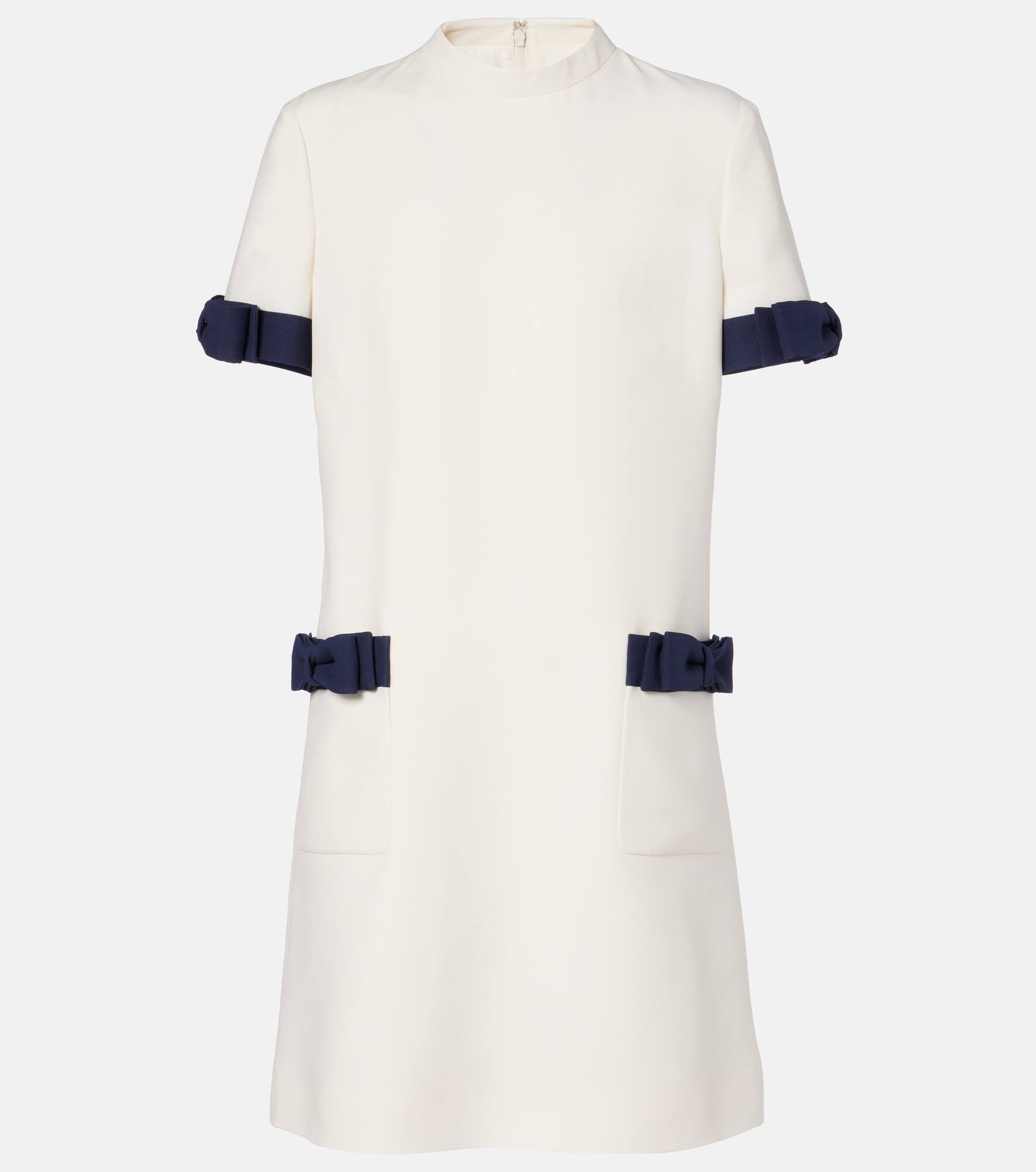 Valentino's signature Crepe Couture fabric – a luxurious wool and silk blend – provides structure and a beautiful drape. This charming minidress is cut to a minimalist silhouette and finished with satin bows at the sleeves and patch pockets. Product Details - Material: 65% wool, 35% silk - Care instructions: dry clean - Made in Italy - Designer color name: Avorio/Indaco - Item color: white, blue - Trim: 65% wool, 35% silk - Lining: 100% silk - Closure: zipped back - Collar: mockneck - Pockets: patch pockets - Fully lined - Item number: P01060183 Size & Fit - True to size - Straight fit - Non-stretchy fabric - The model seen in the picture is 178cm-5'10" and wearing a size IT 40