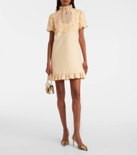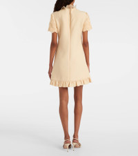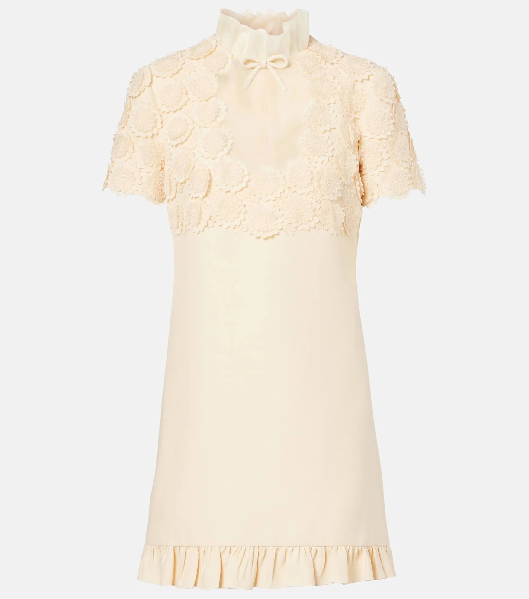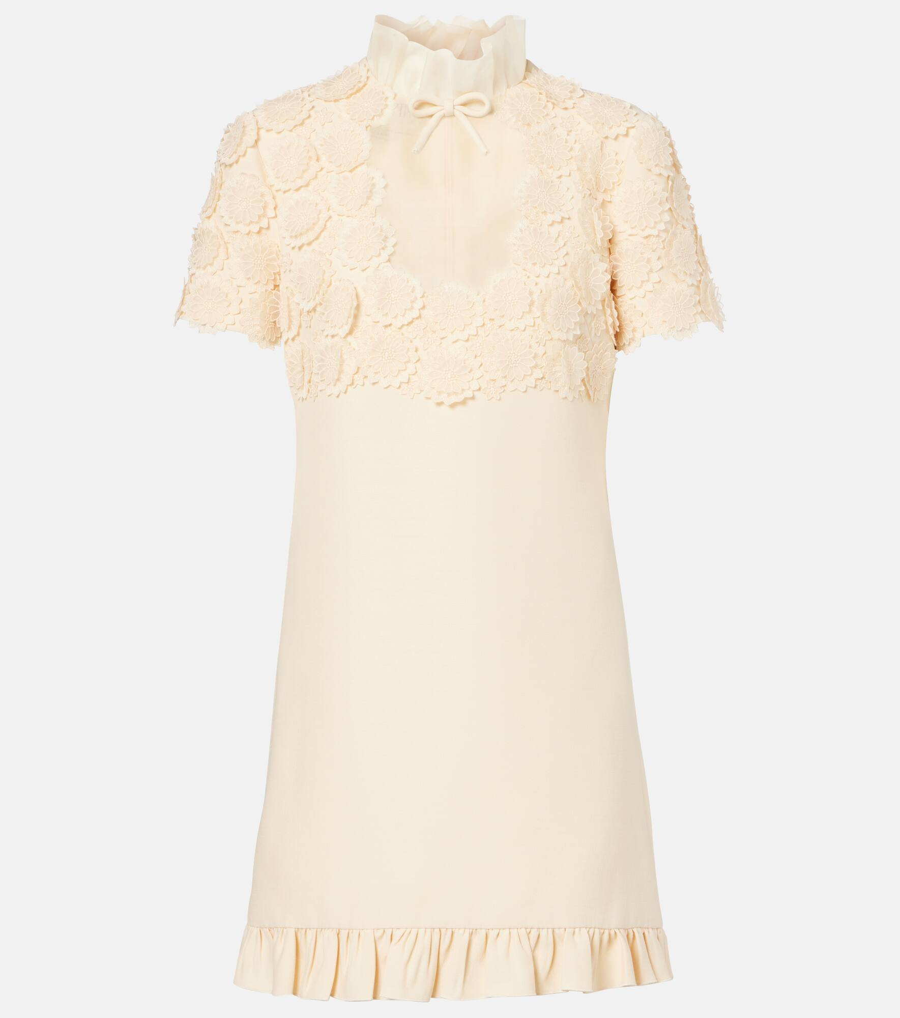 Valentino's signature Crepe Couture fabric – a luxurious wool and silk blend – provides structure and a beautiful drape. This elegant minidress features charming ruffled trims and is enriched with embroidered macrame flowers at the top. Product Details - Material: 65% wool, 35% silk - Care instructions: dry clean - Made in Italy - Designer color name: Betulla - Item color: white - Material II: 100% silk - Lining: 100% silk - Embroidery: 100% polyester - Insert: 100% cotton - Details: 100% silk - Closure: zipped back - Item number: P01060188 Size & Fit - True to size - Straight fit - Non-stretchy fabric - The model seen in the picture is 178cm-5'10" and wearing a size IT 40