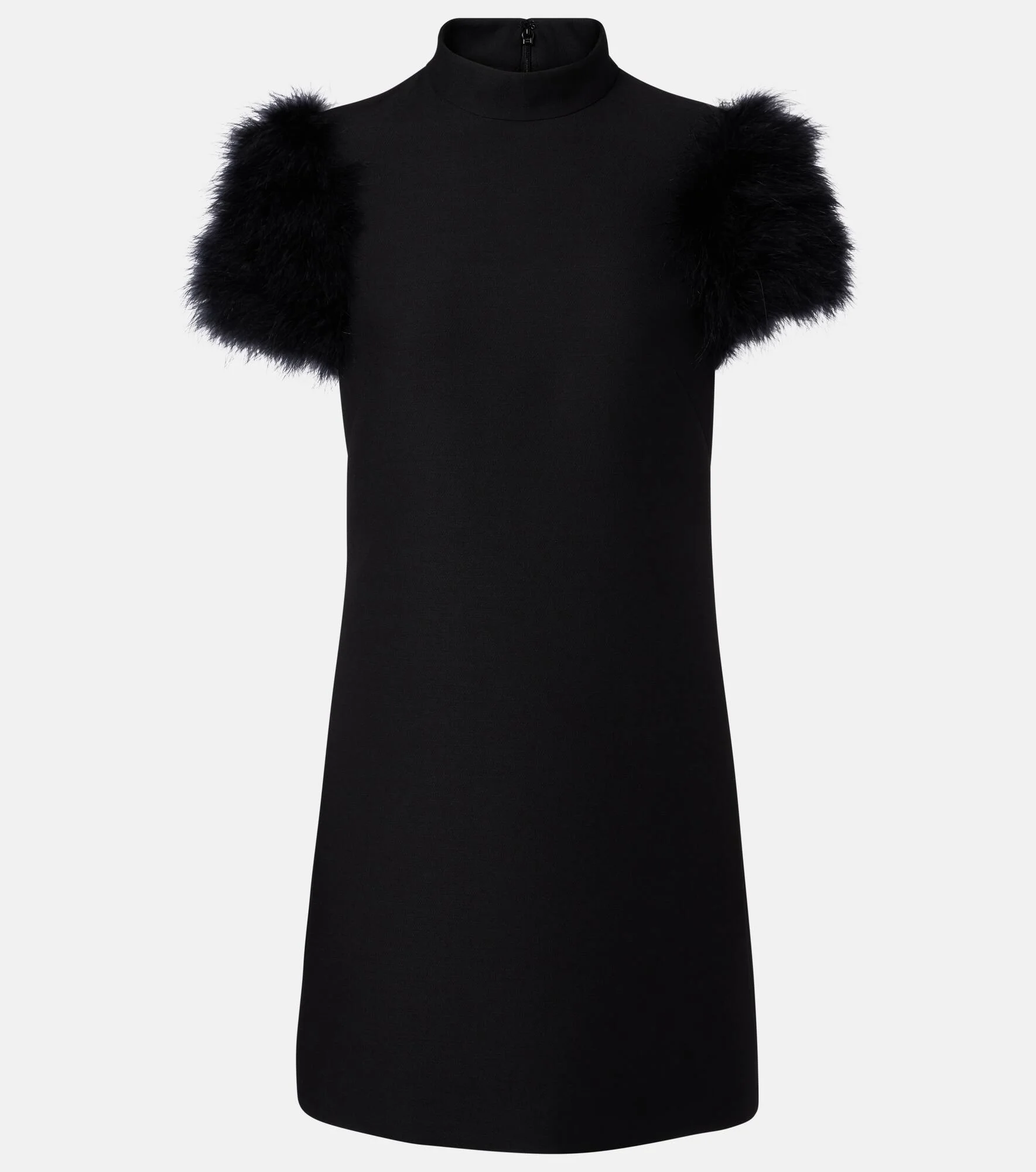 The most established Italian Maison de Couture, Valentino has become a symbol of crafting excellence. Complete with elegant feather trims, this minidress is made in Italy from the brand's signature Crepe Couture fabric, a luxurious blend of wool and silk. Product Details - Material: 65% wool, 35% silk - Care instructions: dry clean - Made in Italy - Designer color name: Nero - Item color: black - Material II: 100% silk - Lining: 100% silk - Insert: 100% feathers - Closure: concealed zipped back - Contains non-textile parts of animal origin - Item number: P01108317 Size & Fit - True to size - Designed for a loose fit - Non-stretchy fabric - The model seen in the picture is 178cm-5'10" and wearing a size IT 40