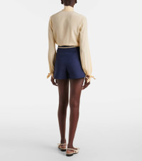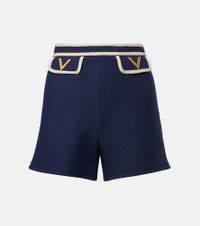 Valentino's signature Crepe Couture fabric – a luxurious wool and silk blend – provides structure and a beautiful drape as seen in these shorts. This elegant style is made in Italy and shaped to a high-rise, wide-leg silhouette. Product Details - Material: 65% wool, 35% silk - Care instructions: dry clean - Made in Italy - Designer color name: Indaco/Betulla - Item color: blue - Material II: 98% polyamide, 2% elastane - Pockets: flap pockets - Pocket lining: 100% silk - Contains non-textile parts of animal origin - Hardware color: antique gold - Closure: zipper, hook fastening - Item number: P01059930 Size & Fit - True to size - Non-stretchy fabric - Wide-leg - High-waisted - The model seen in the picture is 178cm-5'10" and wearing a size IT 40