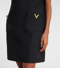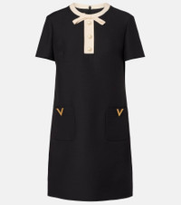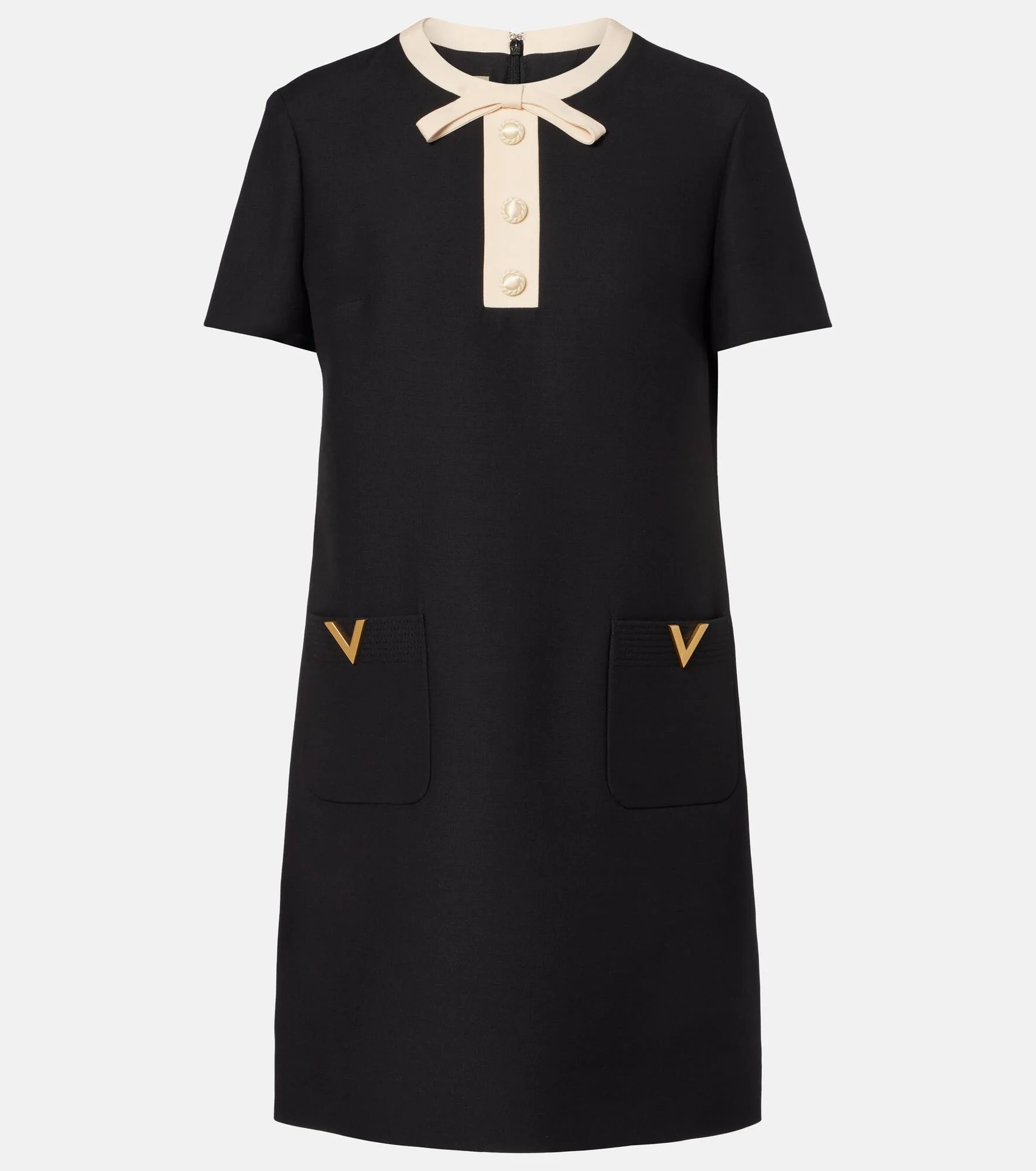 Crafted in Italy from brand-signature Crepe Couture, this dress from Valentino features a structured, mini silhouette. The elegant design is complete with VGold detailing, contrasting trims, and a bow detail at the neckline. Product Details - Material: 65% wool, 35% silk - Care instructions: dry clean - Made in Italy - Designer color name: Nero/Betulla - Item color: black, beige - Lining: 100% silk - Trim: 65% wool, 35% silk - Hardware color: gold - Pockets: patch pockets - Closure: concealed zipped back - Item number: P01108260 Size & Fit - True to size - Cinched waist - Non-stretchy fabric - The model seen in the picture is 178cm-5'10" and wearing a size IT 40