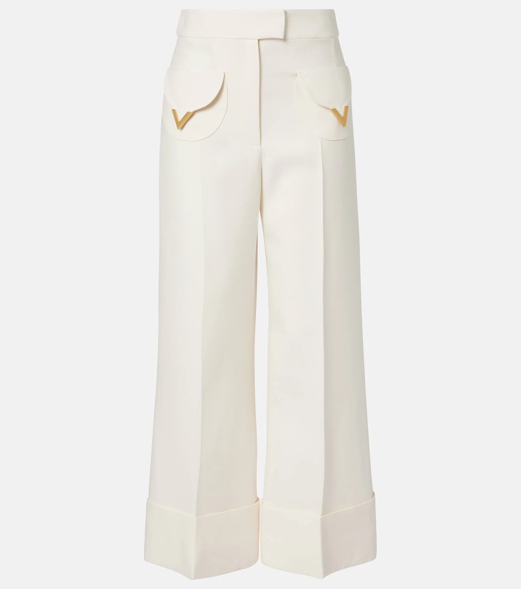 The most established Italian Maison de Couture, Valentino has become a symbol of crafting excellence. These culotte-inspired pants are made in Italy from the brand's signature Crepe Couture fabric, a luxurious blend of wool and silk. Product Details - Material: 65% wool, 35% silk - Care instructions: dry clean - Made in Italy - Designer color name: Avorio - Item color: white - Lining: 100% viscose - Closure: zipper fly, button and hook fastenings - Pockets: snap-buttoned pockets, back pockets - Hem: cuffed - Item number: P01108227