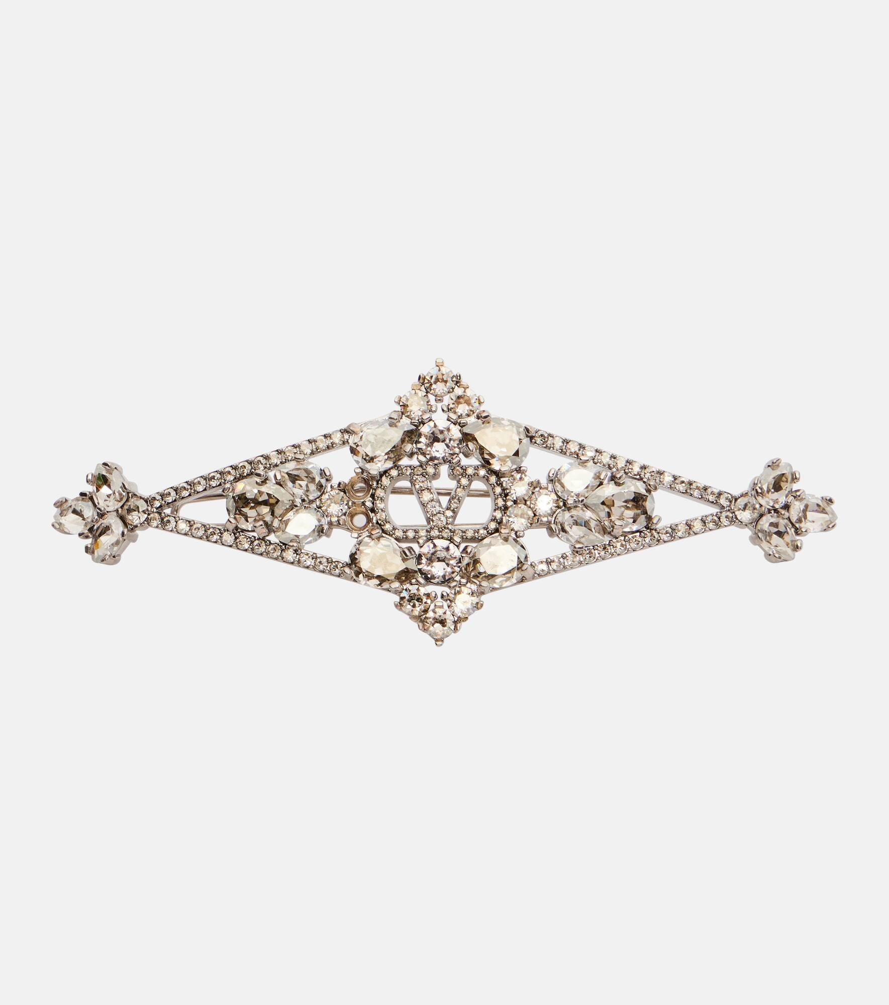 Add a touch of opulence with this Valentino barrette, crafted in a sleek silhouette and adorned with sparkling embellishments, perfect for elevating everyday looks or finishing evening ensembles with polish. Product Details - Material: brass, crystals - Made in Italy - Item color: silver - Item number: P01056344 Size & Fit - Length 9cm-3.5" - Max. width 3cm-1"