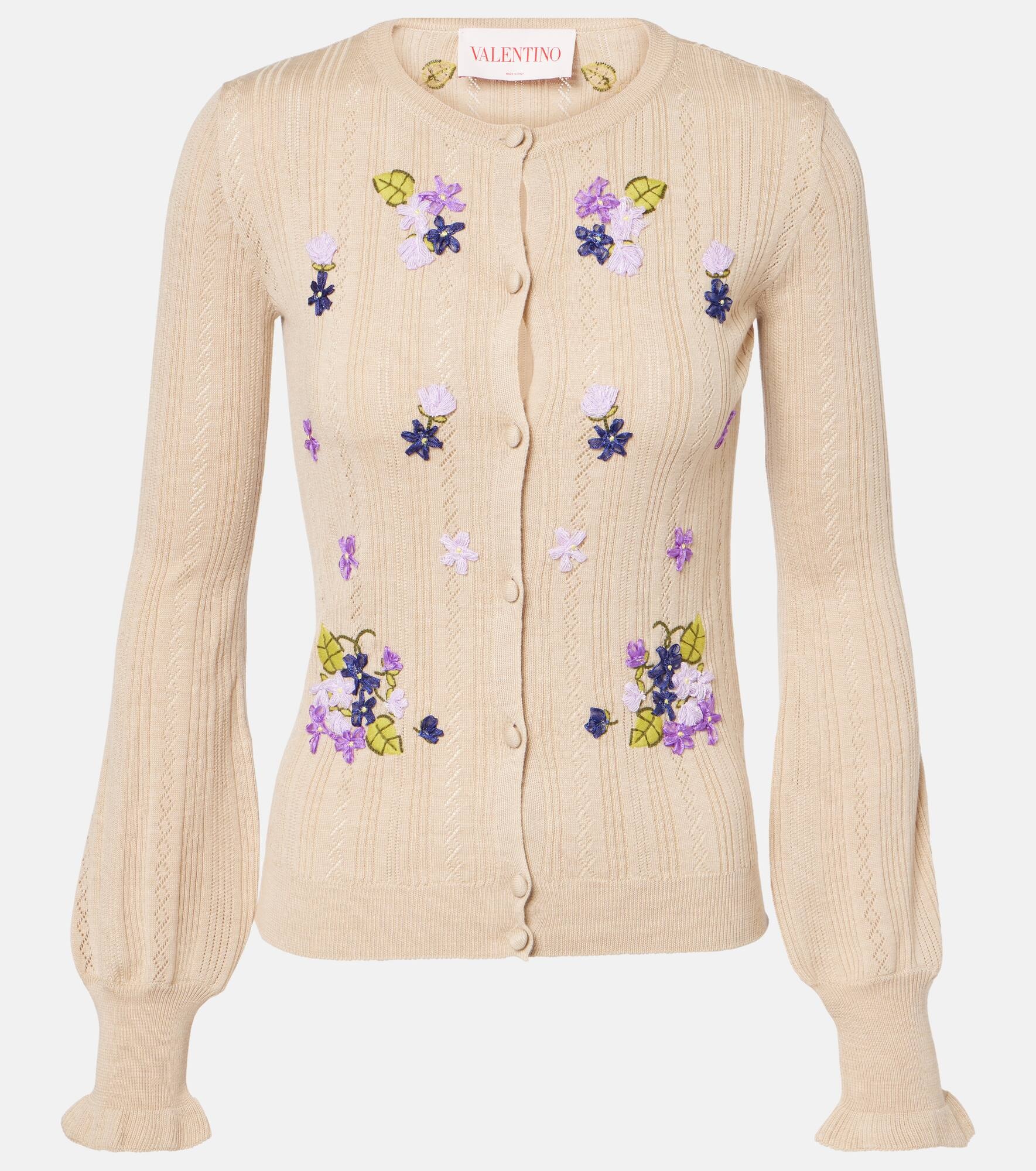 Embroidered floral details lend this cardigan from Valentino a playful charm. Crafted from virgin wool, it features tonal buttons, ribbing, and bishop sleeves accented with ruffled cuffs. Product Details - Material: 100% virgin wool - Care instructions: dry clean - Made in Italy - Designer color name: Beige+Multicolor - Closure: buttoned front - Item number: P01006502 Size & Fit - True to size - Straight fit - Stretchy fabric - Falls to the hip - The model seen in the picture is 178cm-5'10" and wearing a size XS