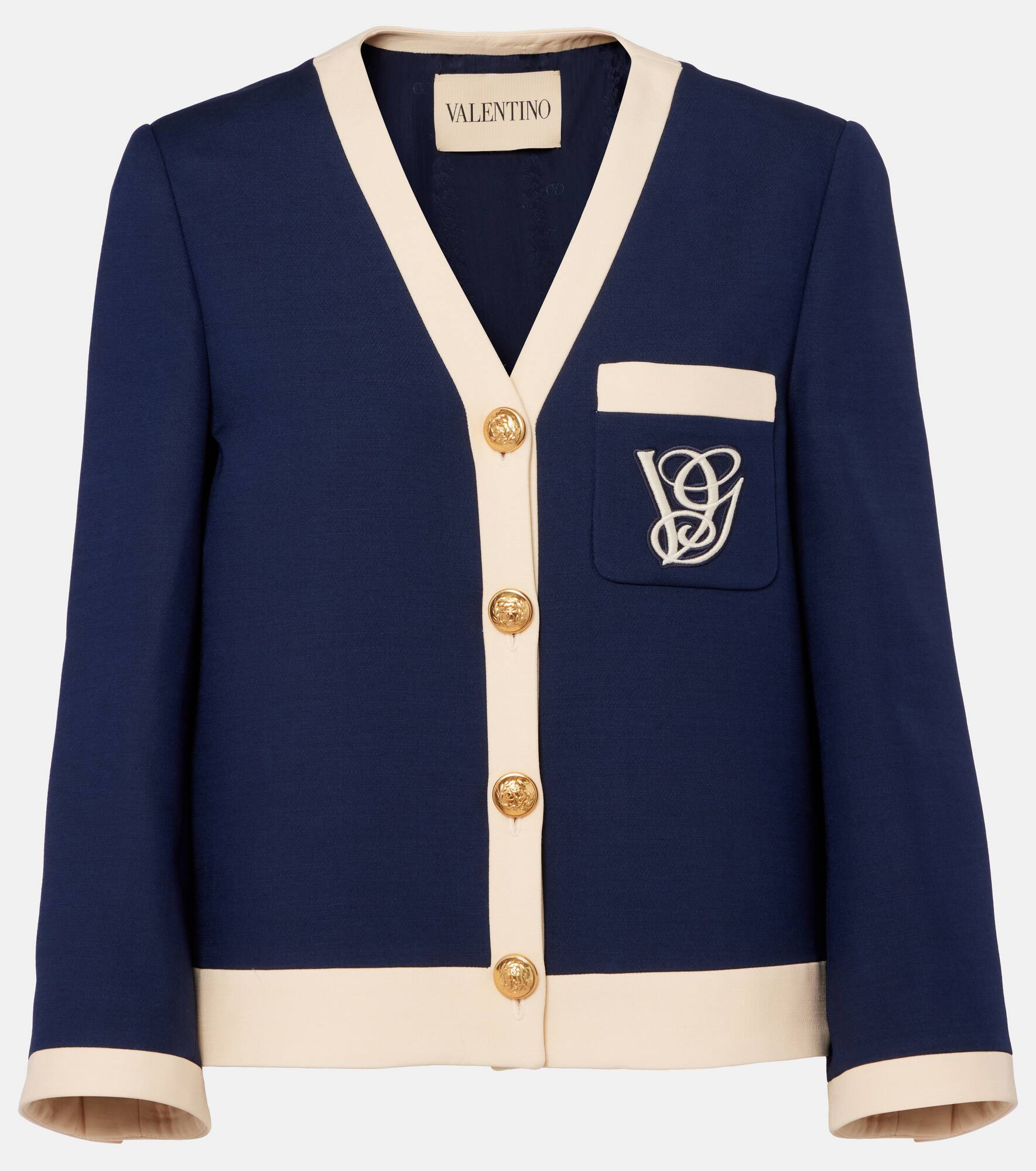 Crafted from wool and silk, this jacket from Valentino falls to the hip and features a straight silhouette. The sophisticated design is complete with a V-neckline, shoulder pad inserts, and a logo embroidered chest pocket. Product Details - Material: 65% wool, 35% silk - Care instructions: dry clean - Made in Italy - Designer color name: Indaco/Betulla - Item color: blue, beige - Lining: 100% viscose - Embroidery: 100% polyester - Trim: 64% cotton, 36% viscose - Closure: buttoned front - Collar: V-neck - Cuff: two buttons - Shoulder pads - Pockets: patch - Fully lined - Item number: P01059641 Size & Fit - True to size - Straight fit - Non-stretchy fabric - Falls to the hip - The model seen in the picture is 178cm-5'10" and wearing a size IT 40
