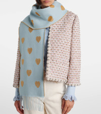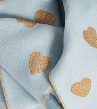 Finish looks on a charming note with the Heart scarf from Valentino. The soft design is crafted in Italy from a wool blend, has fringed ends, and is complete with metallic detailing. Product Details - Material: 70% wool, 19% viscose, 6% metallic fibres, 5% cashmere - Care instructions: dry clean - Made in Italy - Designer color name: Celeste-Oro/Oro - Item color: blue, gold - Hardware color: gold - Item number: P01056288 Size & Fit - Length 180cm-71" - Width 23cm-9"