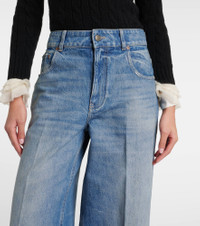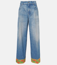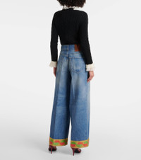 These jeans from Valentino are cut from cotton denim and defined by a high-rise fit. The design falls to a flattering wide-leg, creating an ideal silhouette for multiple styling possibilities. Product Details - Material: 100% cotton - Care instructions: dry clean - Made in Italy - Designer color name: Medium Blue Denim - Closure: zipper fly, button fastening - Pockets: five pockets - Details: 100% leather - Lining: 65% polyester, 35% cotton - Contains non-textile parts of animal origin - Trim: 40% cotton, 40% acrylic, 16% polyamide, 4% metallic fibres - Belt loops - Item number: P01006491 Size & Fit - True to size - Non-stretchy fabric - Wide-leg - High-rise - The model seen in the picture is 178cm-5'10" and wearing a size 26