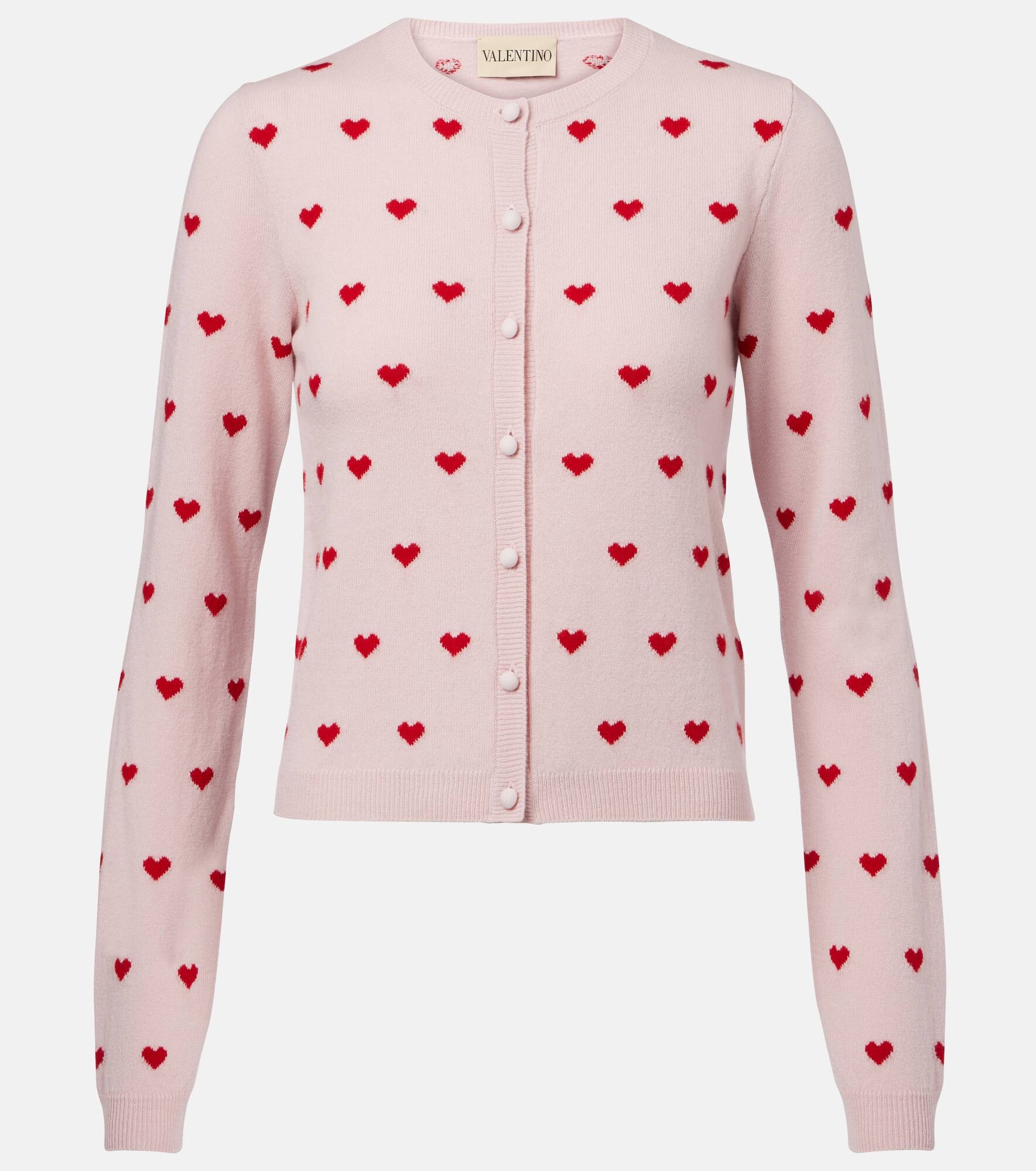 Characterized by a charming jacquard motif, this cardigan from Valentino boasts romantic appeal. The design is finely knitted from virgin wool for a regular fit and is finished with ribbed trims. Product Details - Material: 100% virgin wool - Care instructions: dry clean - Made in Italy - Designer color name: Grey Rose/Paris - Item color: pink, red - Closure: buttoned front - Collar: crewneck - Cuff: ribbed - Hem: ribbed - Item number: P01059792 Size & Fit - True to size - Straight fit - Stretchy fabric - Falls to the hip - The model seen in the picture is 178cm-5'10" and wearing a size XS