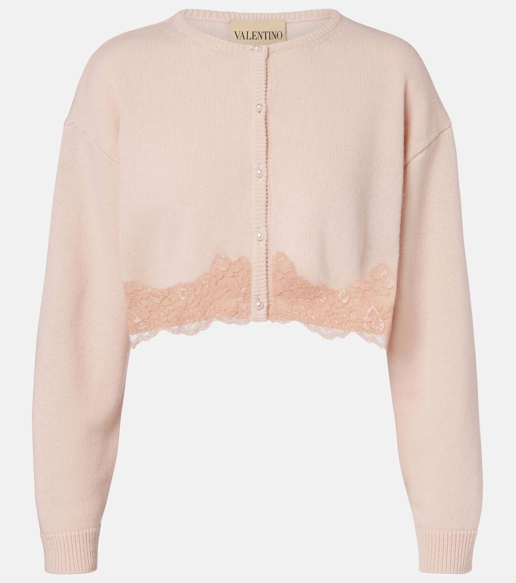 Valentino has become a symbol of crafting excellence, creativity, and uniqueness. Italian-made from virgin wool, this cardigan features a cropped silhouette finished with a delicate lace-trimmed hemline. Product Details - Material: 100% virgin wool - Care instructions: dry clean - Made in Italy - Color: pink - Designer color name: Cipria - Lace: 48% polyamide, 36% viscose, 16% elastane - Cuff: ribbed - Closure: buttoned front - Item number: P01107892 Size & Fit - True to size - Dropped shoulders - Designed for a loose fit - Slightly stretchy fabric - Cropped - The model seen in the picture is 178cm-5'10" and wearing a size XS